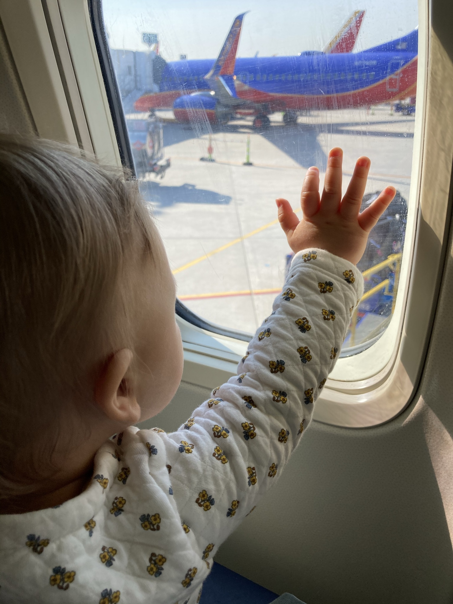 Since we have already reported the play-by-play of all the fun we had over the weekend, I thought I’d share how we did on the airplane. While being in crowds in an enclosed space after 13 months of…not doing that…was a bit much, I was happy to find that you can still depend on the kindness of strangers. I was able to tote Katie, a suitcase, and a huge diaper bag with me through the airport and onto the airplane and into a window seat only because several people offered to carry my bags, make room for us to move around, and pick up various items from beneath their seats over and over again.