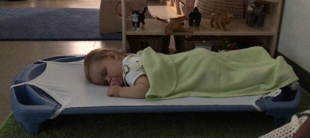 Here she is passed out from stress napping peacefully on her first day. She has been eating lunch and 2 snacks, drinking milk and water, and sleeping without a problem each day. We receive app notifications throughout the day with updates, such as when she has her diaper changed. (And thank god for that! I am thrilled to know any detail of the 8 hours she spends away from us, even if it’s just notice of a “BM.”)