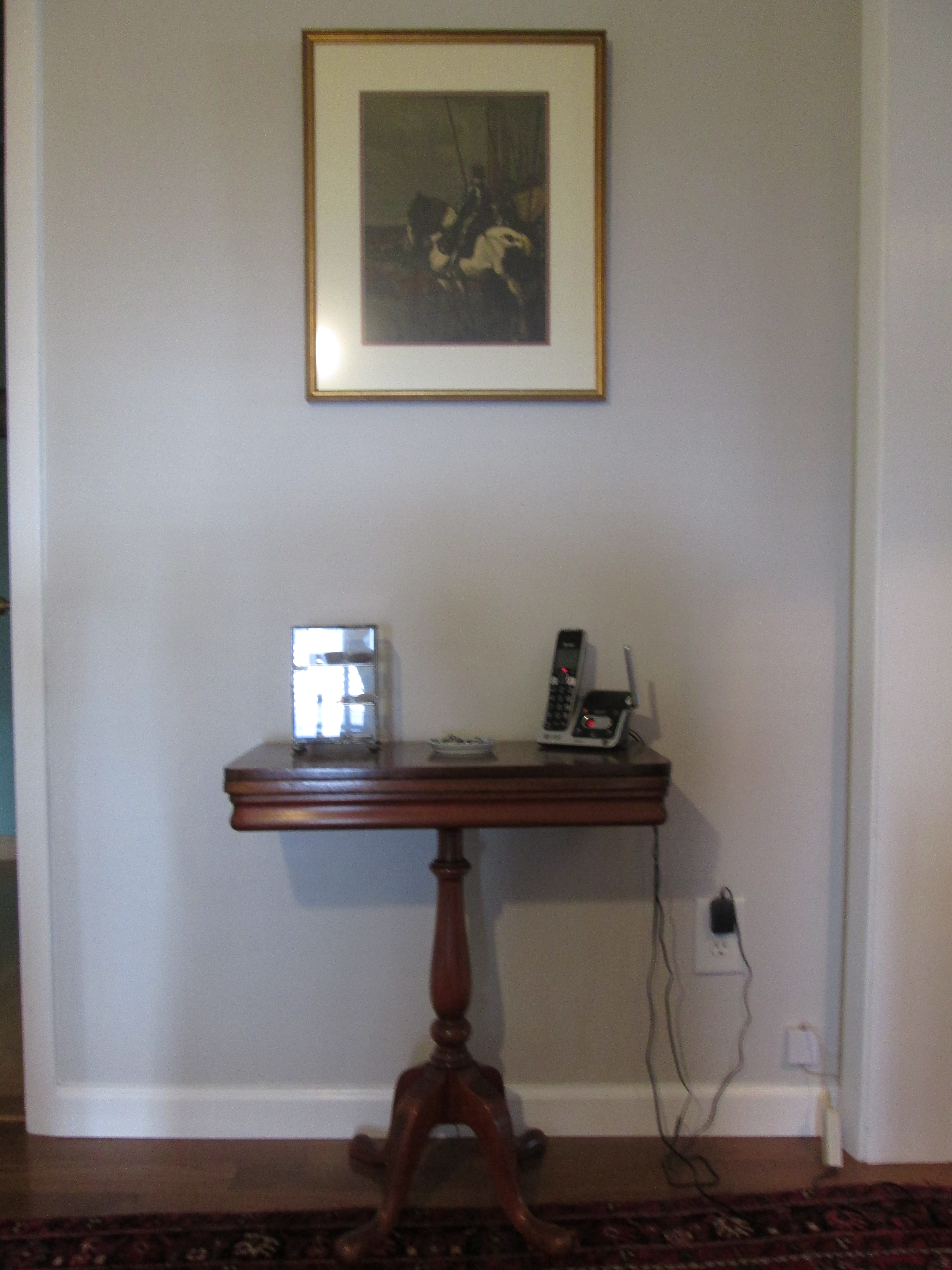 In other home improvement news, I participated in another online auction and won a lot consisting of two tables, a lamp (not pictured here) and a couple of small glass display boxes. The nicer table is actually a miniature card table. The top rotates open and folds out to make a square. I’ve put that table in the back hall, and, yes, our phone uses a landline.