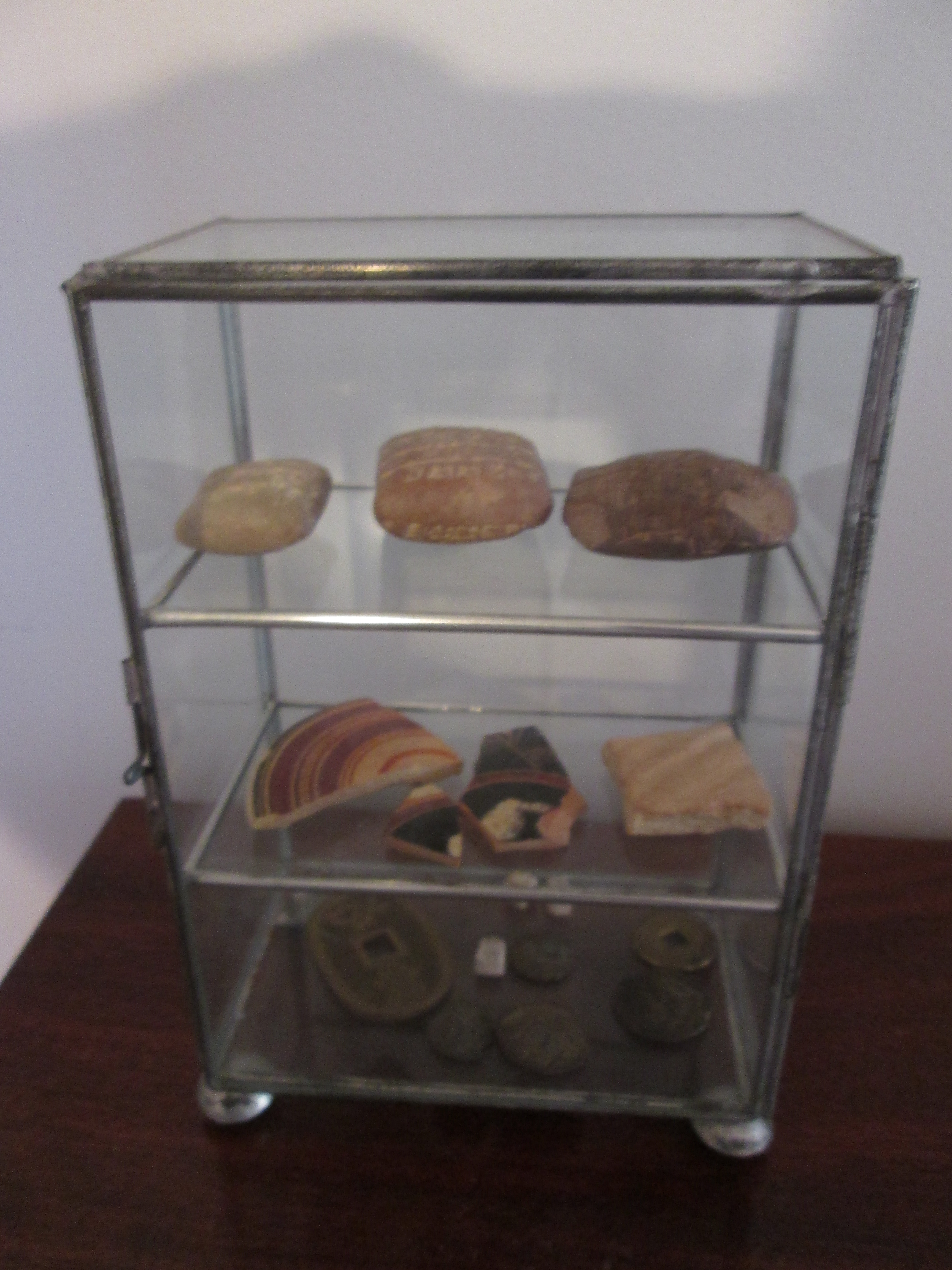 The little display case houses my cuneiform tablets (3rd millennium Sumerian), some ancient potsherds (Greek Dark Age and Classical, and Egyptian Amarna period) and coins (Chinese and Roman).