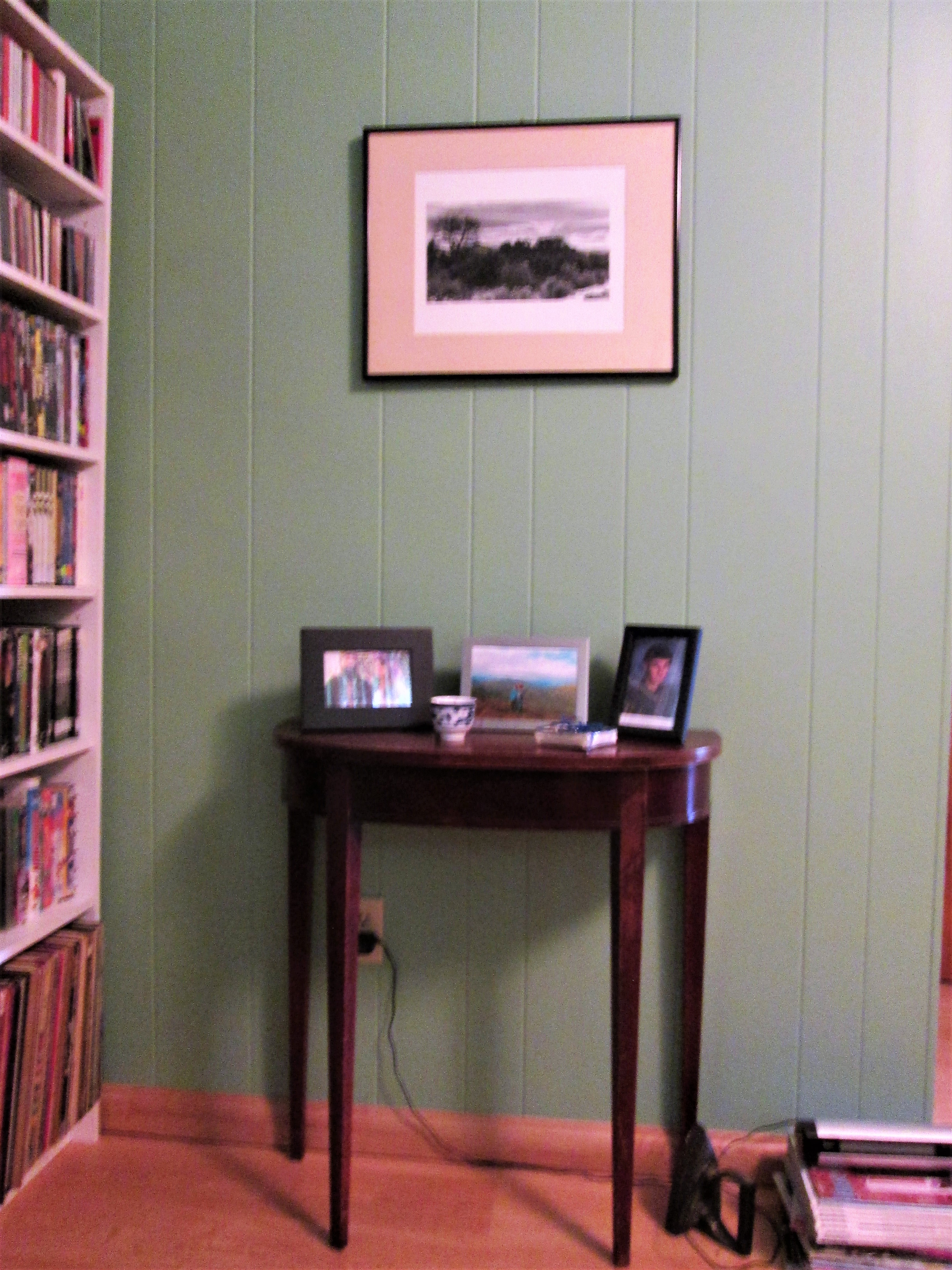 As usual, all my photos are blurry because I’m an incompetent old lady with shaky hands, and I don’t have a fancy camera phone, but you get the idea. By the way, my talented niece and fellow blogger Mary took the photo on the wall above the table. I think it looks great against the green wall.