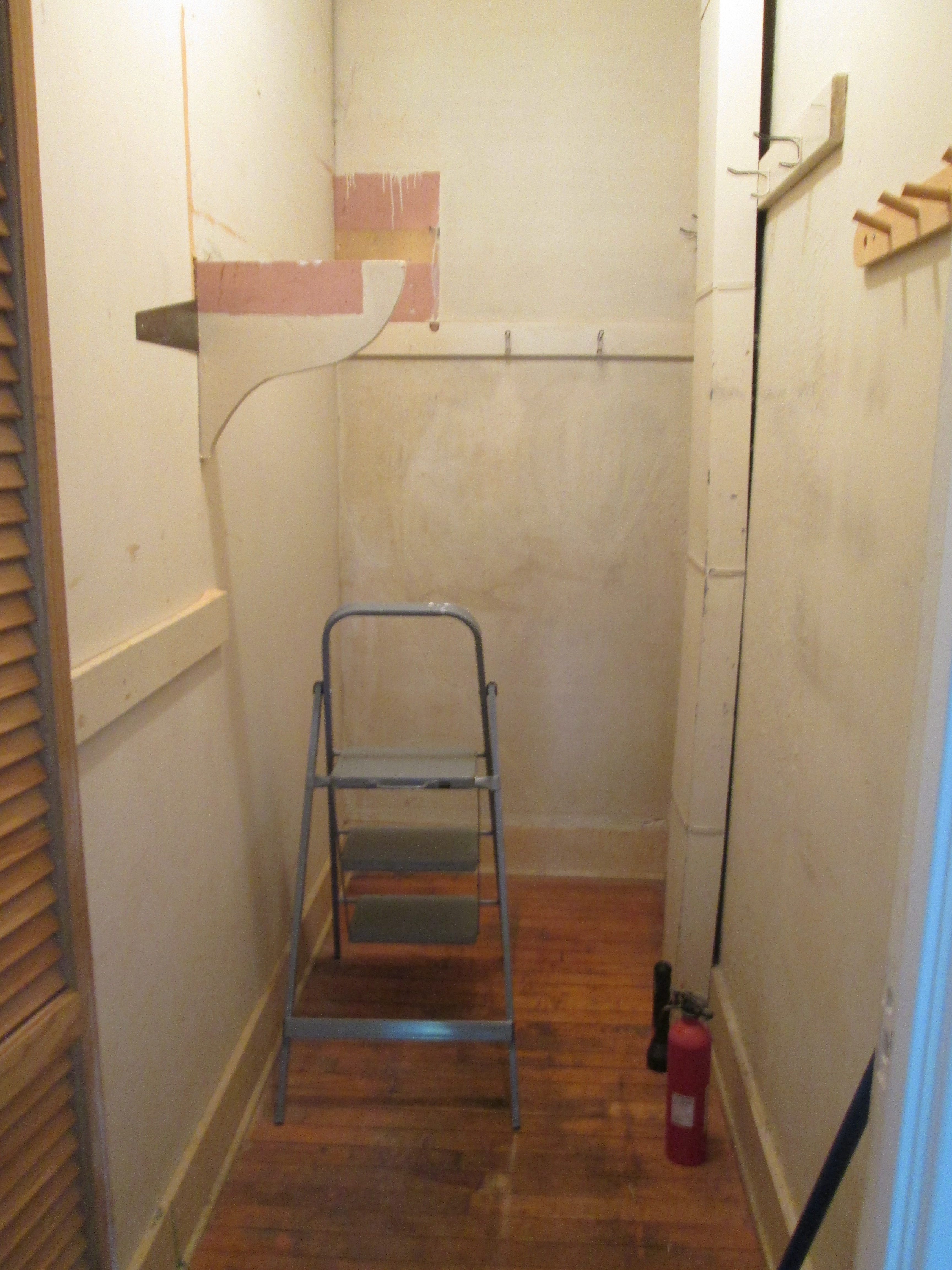 After a brief hiatus, Dual Personality #2 has returned to bring you up to date on some of my recent domestic activities. I haven’t posted for a while and we have a fair amount of catching up to do. Today, I thought I’d fill you in on slight improvements to the house; I’ll save the family news for next time. Way back in May, 2019 I wrote about my attempt to clean and reorganize our pantry. If you had asked me about it earlier today, I would have sworn that I wrote that post in March of this year, which just goes to show how completely boggled up my sense of time has become. Zut alors! Anyway, I decided to do a big closet refurb. I emptied it down to the bare walls, even removing the old wooden coat rail and shelves. You can see just how awful the many layers of dirty tan, pink and yellow paint had become. I’m rather horrified to think that it took so long to get around to doing this job.