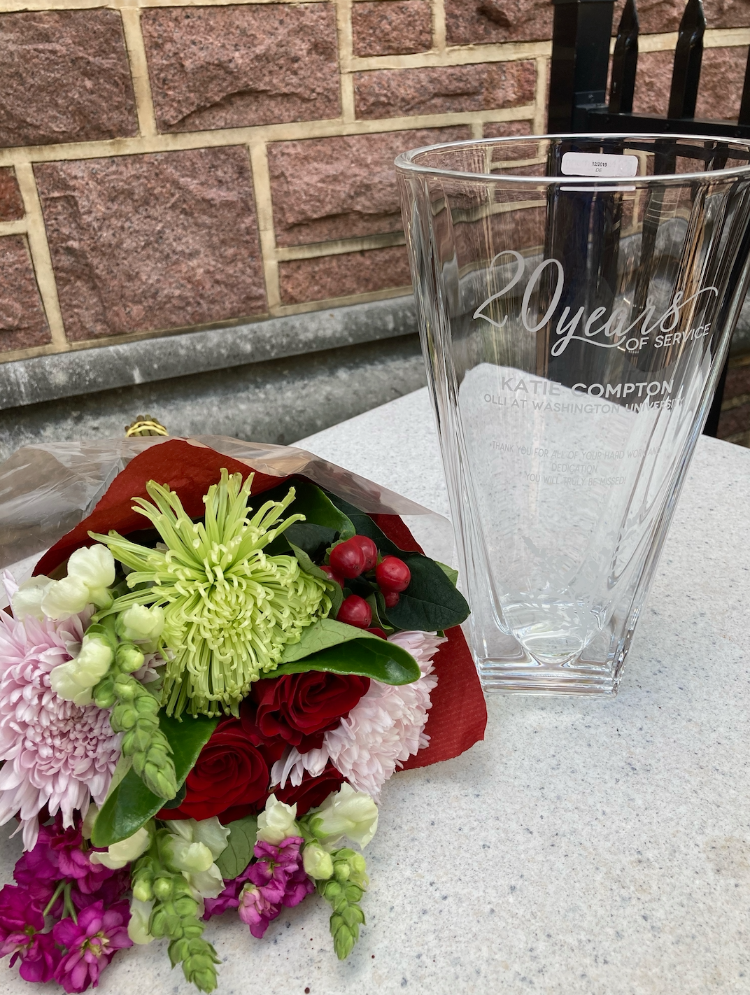 In other news, daughter #1 came home on Thursday in order to attend my flyover university retirement event along with the OM and the boy. Because of COVID, events such as this are now limited to 30 people, must be held outside and food cannot be served. Let the festivities begin. There was a giant TV screen set up in the courtyard so a 30-minute video could be shown celebrating moi. However the sun was shining and so the video was unviewable. Everyone huddled under the spindly trees in order to catch a breeze in the humid 95-degree swelter and there was no water served. They gave me a cut crystal vase engraved with “Twenty Years”…