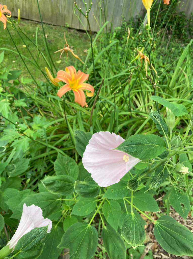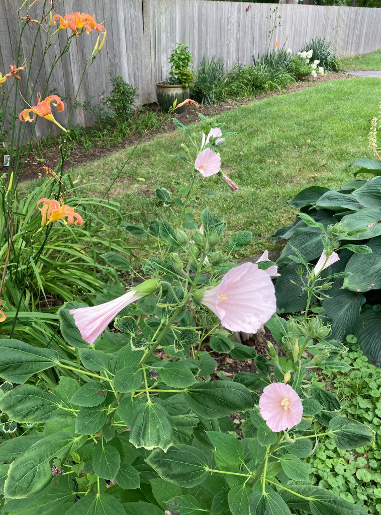 You will recall that years ago I planted seeds given to me by my assistant (harvested from her yard) and they grew and bloomed once. Since then the plants have grown but never bloomed. Either they were cut down by accident, eaten by deer (?) or whatever. But, hallelujah, they have bloomed again! This brings me joy. You can see, too, that the Tiger Lilies are still going strong (all over our flyover town). I guess they like all the rain we’ve had.