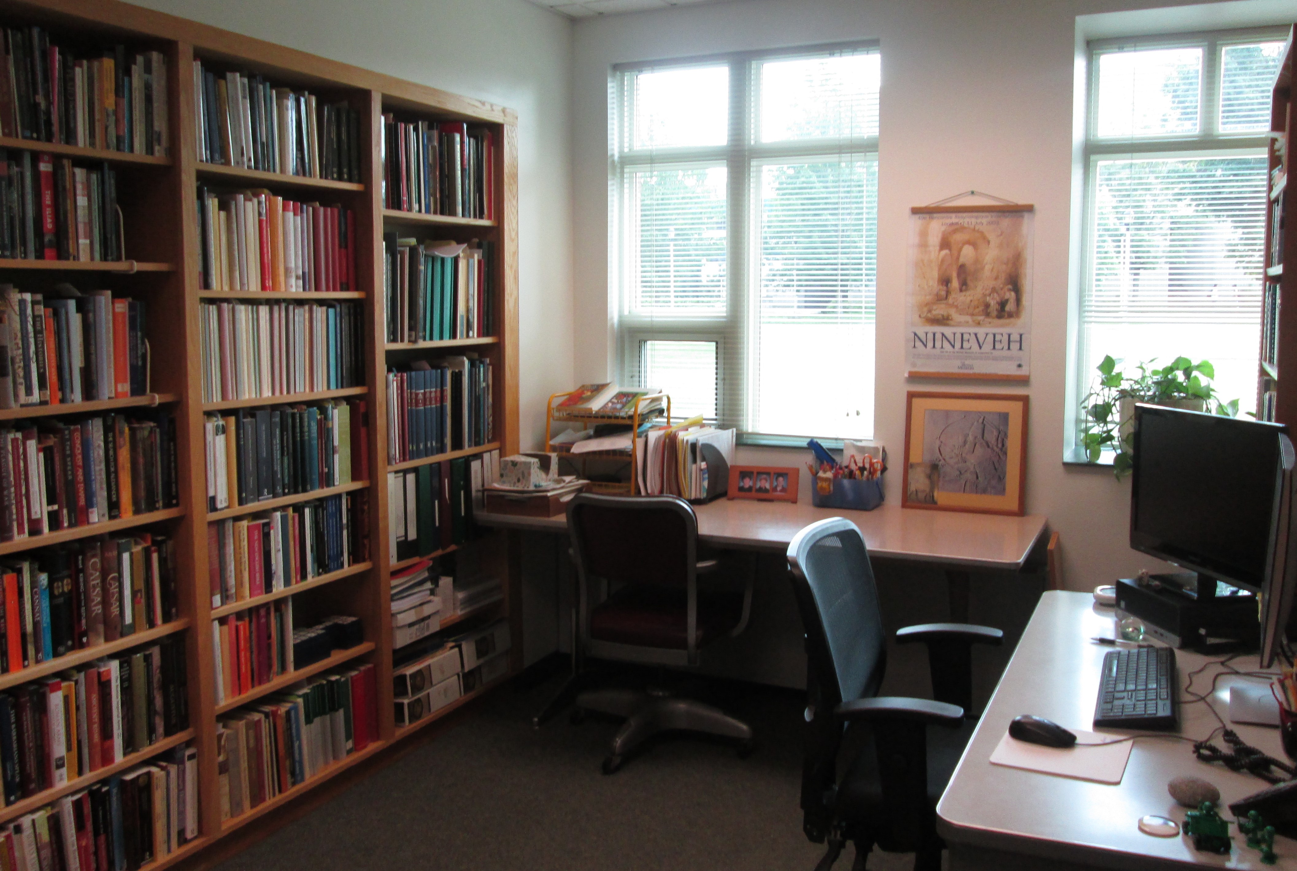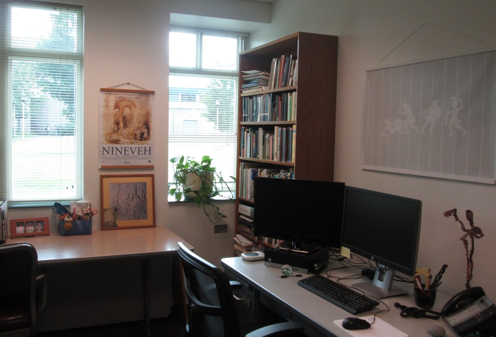 Note the new poster half-frames, a marvelous invention that a colleague recommended. These ingenious ‘frames’ consist of four strips of magnetized wood, two at the top and two at the bottom of the poster, so that the it hangs correctly. Frames come in a wide variety of sizes, are incredibly easy to assemble and look great. (A number of different companies make these and I chose almost randomly; I’m not endorsing one in particular.) Here’s another view of the office.