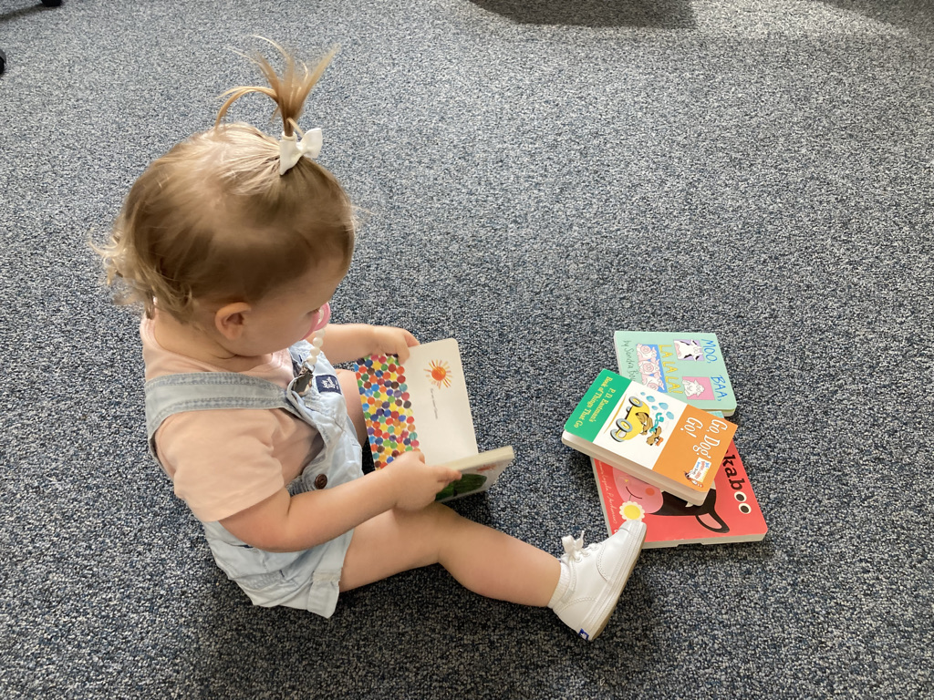 I hadn’t realized that it was a move-in weekend, so we had to navigate the traffic jam of SUVs filled with laundry baskets, mini fridges, and angst. It was a lot, and I’m sure people were confused by the presence of a toddler. Katie was equally wary of them, but here she is, ready for Intro to Literature: