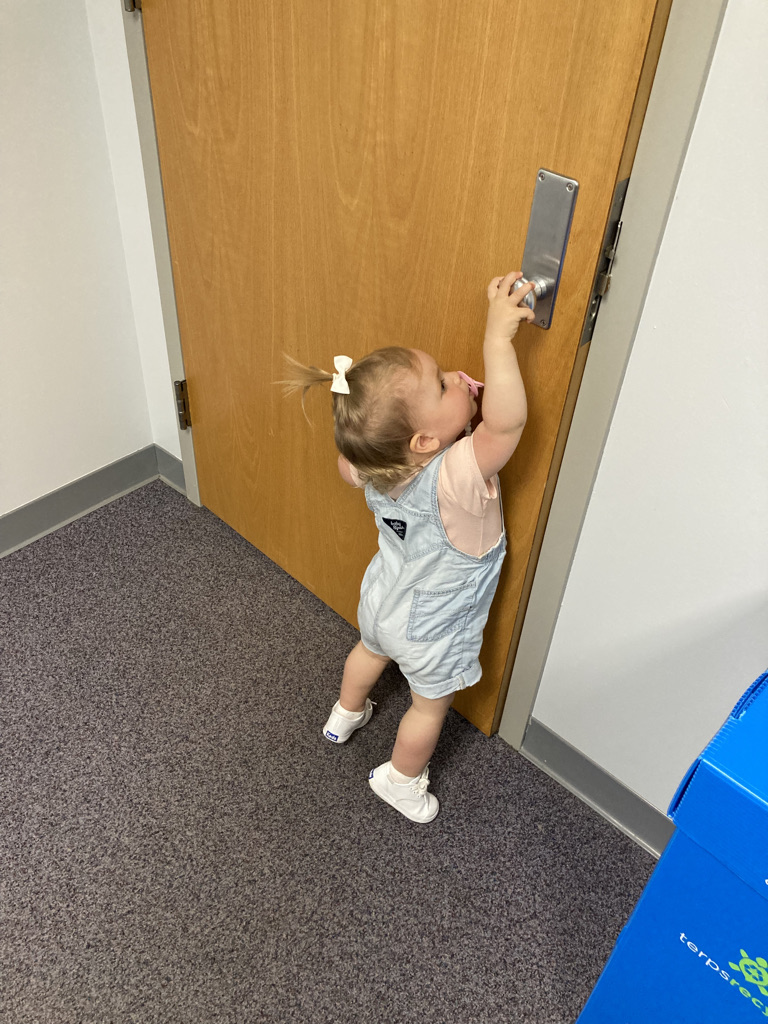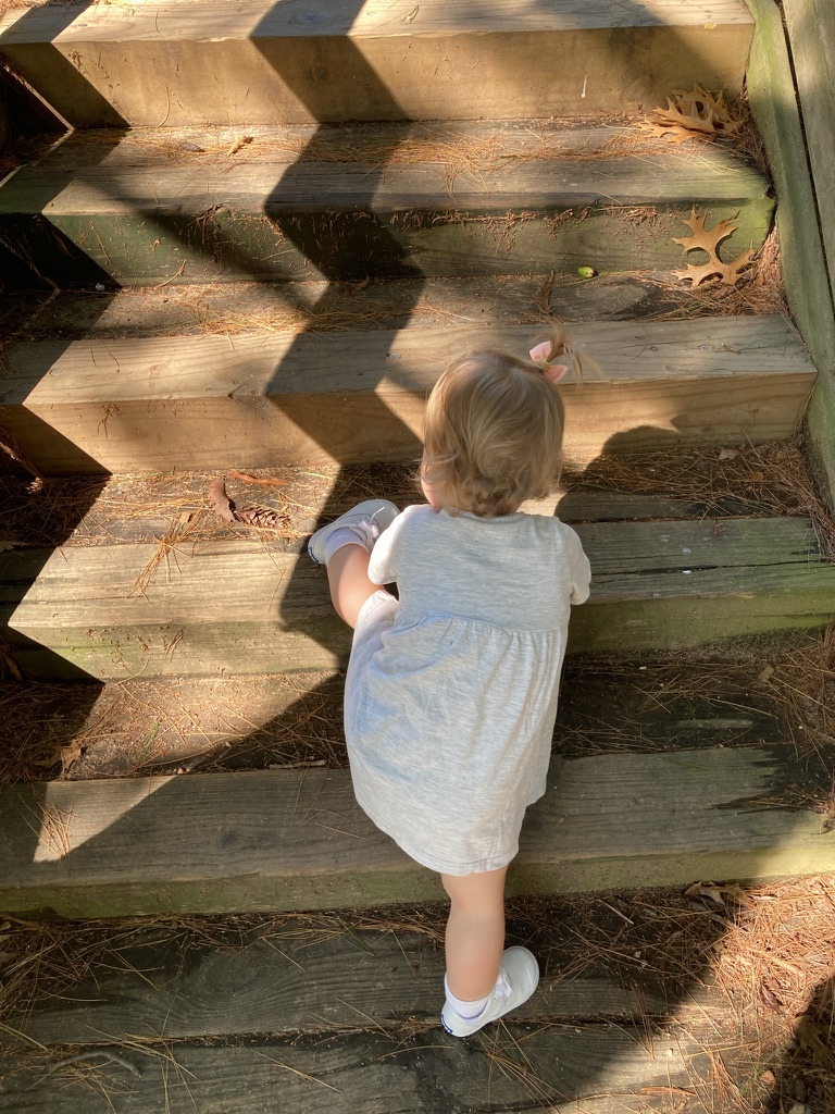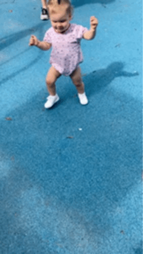 After taking a couple of tentative steps here and there, she was off to the races with a short trip down a hallway on Friday night. By Saturday, she was walking everywhere. Though still a bit wobbly, Katie goes for it with gusto and is pretty fearless. She wants to walk around every corner of the house, in the parking lot, at the playground — anything goes.