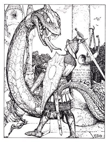 In this one a young knight faces a very nasty looking dragon and what looks to be a giant. The odds do not favor the knight.