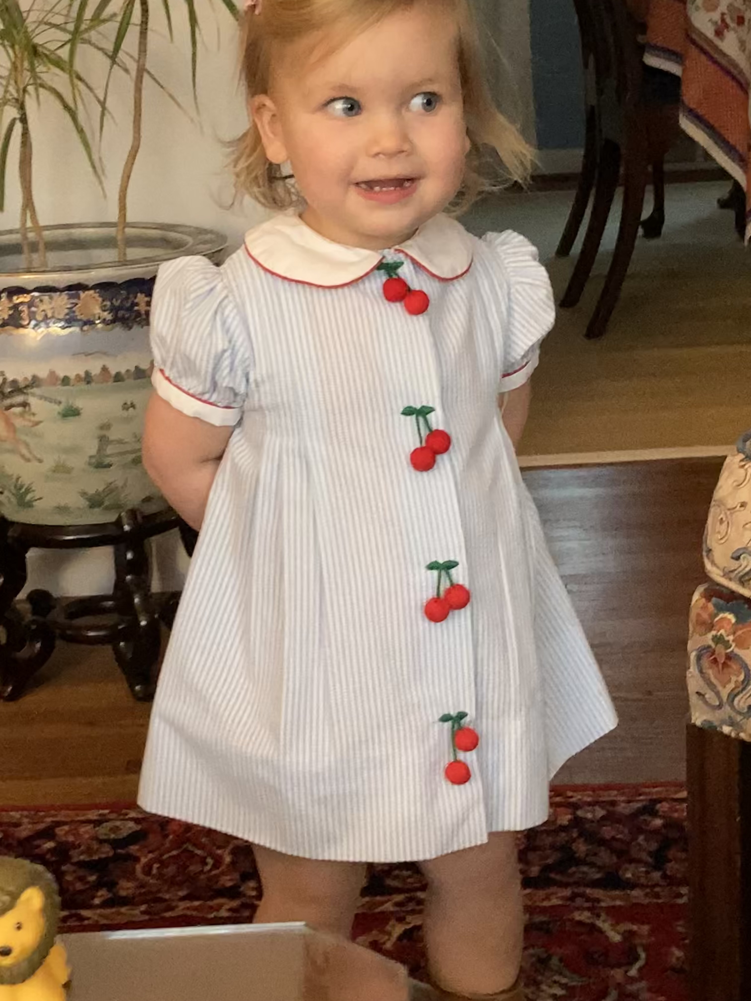 Here she is wearing an old dress of her mommy’s. Can we say, owning it?