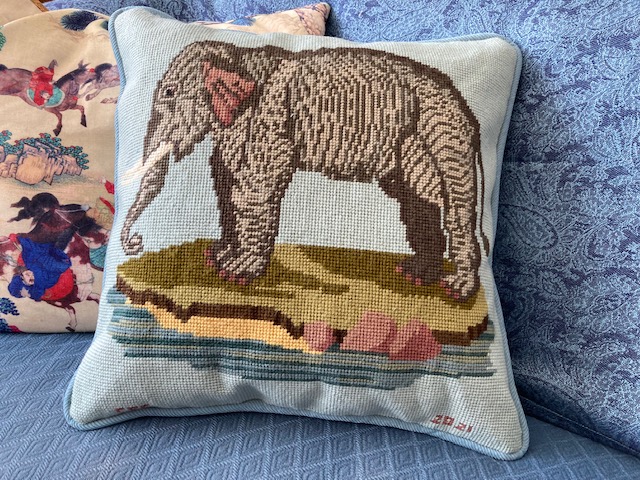 After four months at the finisher, my elephant pillow is back! Pretty fab, if I don’t say so myself.