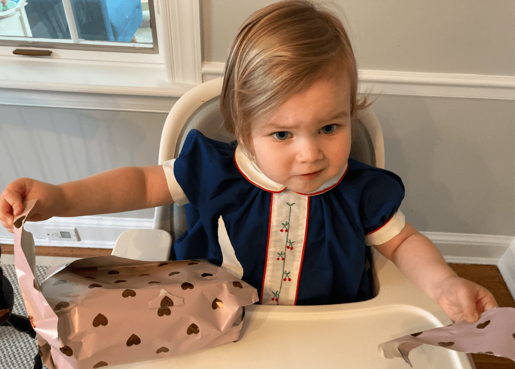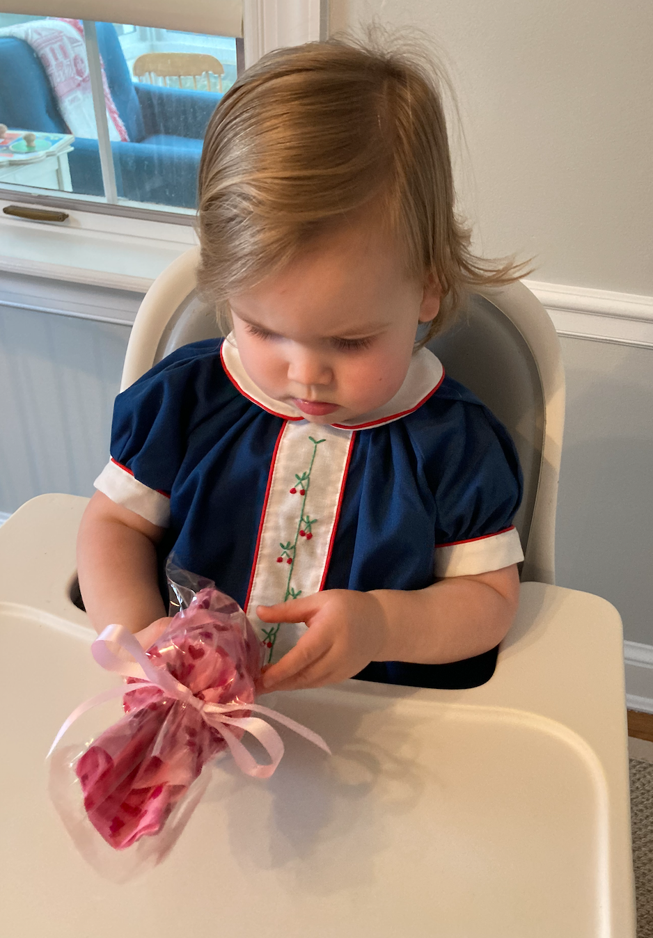 My sarcastic captions are really not appropriate, as Katie was genuinely thrilled to unwrap Play-Doh and a new set of bath toys. And I got to enjoy seeing her in a vintage cherry dress from my childhood, which she wore happily, along with cherry bloomers from her mamu and tights from her aunt Mary. What else do you need in a Valentine?