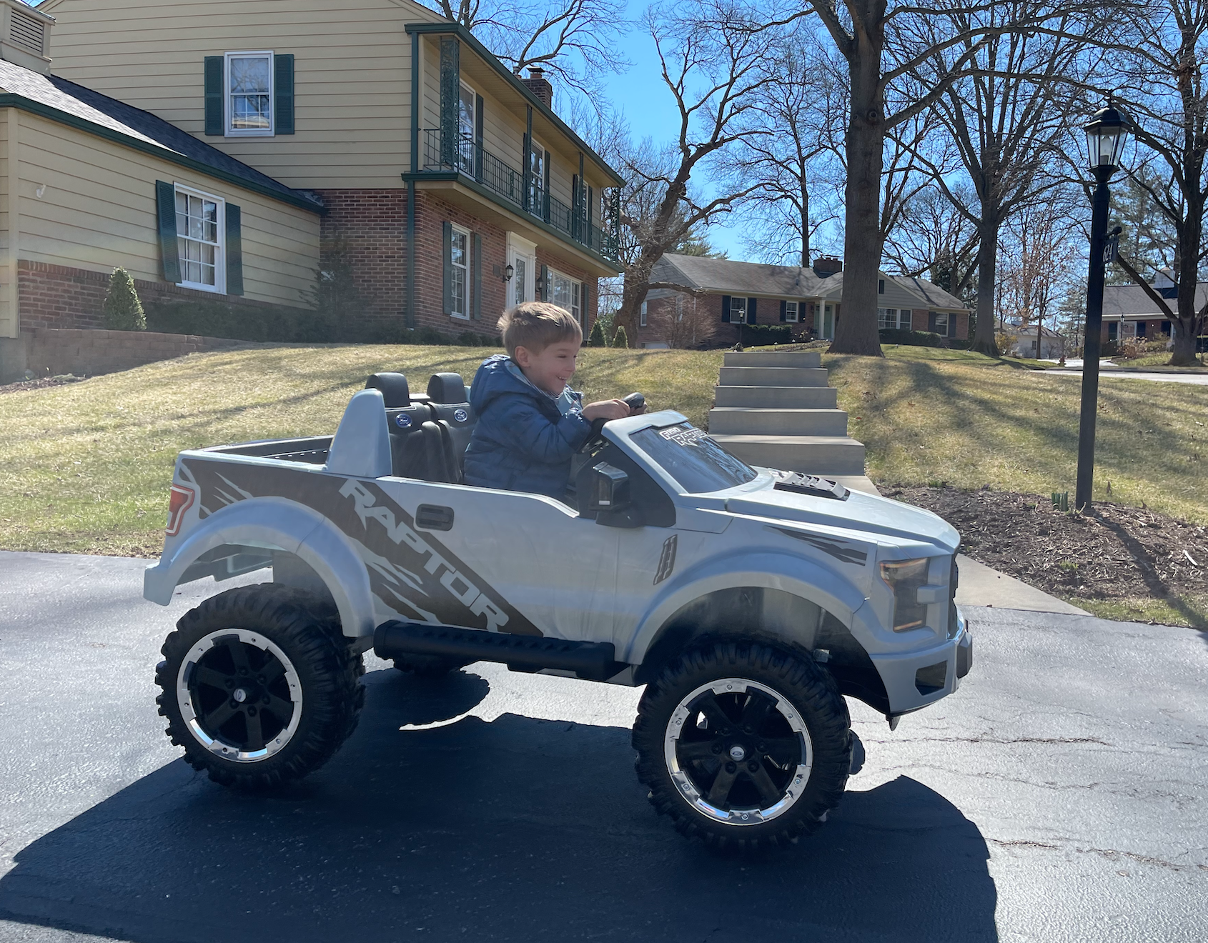 After church we ate bagels and then played outside. The wee laddie took the Raptor out for a spin…