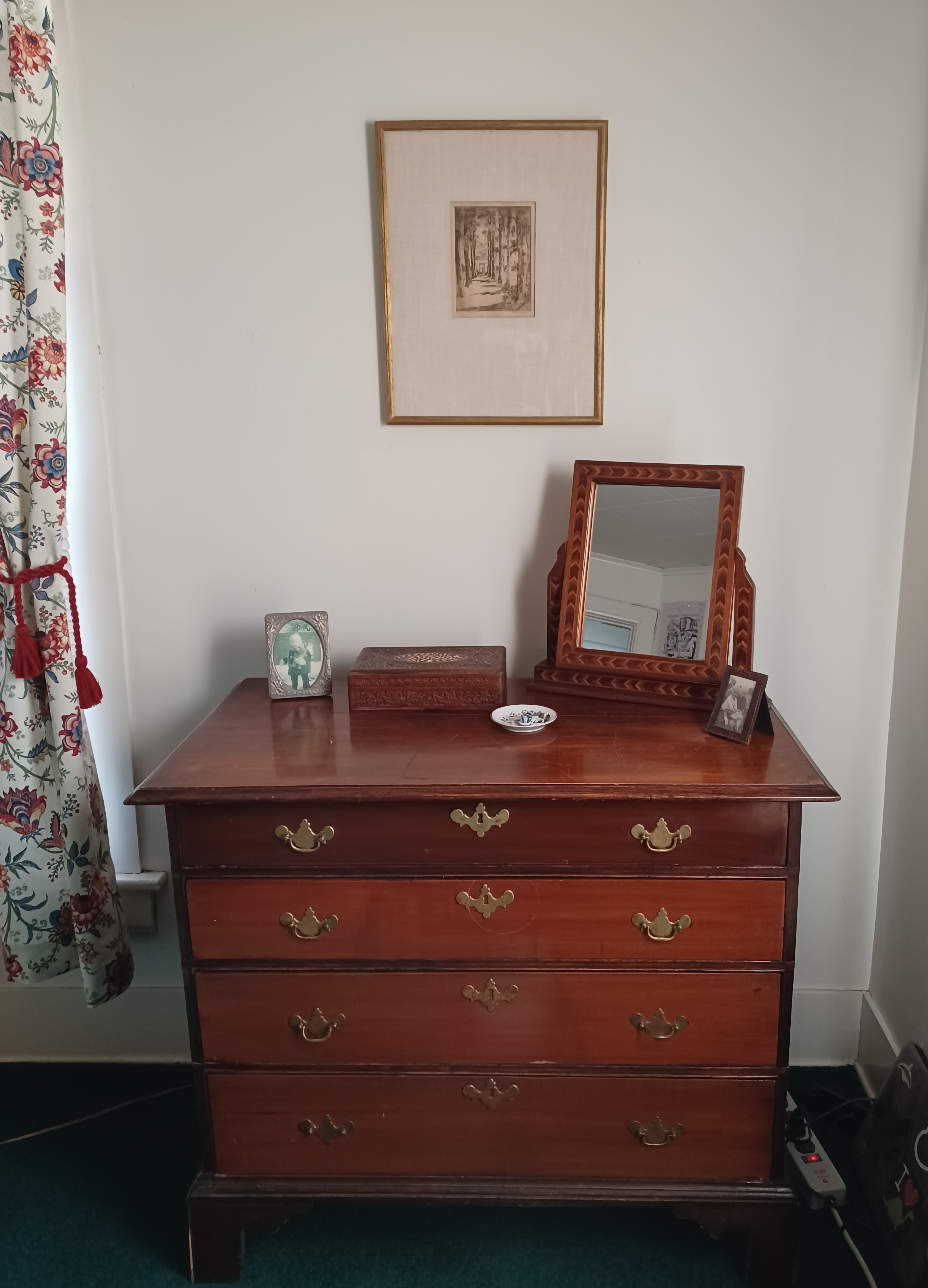 Spring arrived this week. The daffodils are blooming and new leaves are beginning to turn bare branches green. I’ve started spring cleaning the house and rearranging things a bit. Taking my DP’s advice, I did not reframe one of the etchings I recently purchased. It is now on the wall in son #1’s old room, where it sits above my other recent acquisitions, the dresser and mirror. Note the new curtains as well. I’m still deciding what to do with the smaller etching.