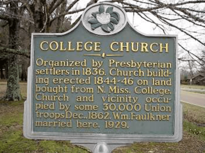 I was sad to read that the College Hill Presbyterian Church in Oxford, Mississippi, had burned to the ground. The church was built in 1846 and was the oldest church structure in Oxford, as well as the oldest Presbyterian church in all of North Mississippi. The grounds of the church were used by Union troops under Generals Grant and Sherman during the Civil War, and it is where William Faulkner was married.