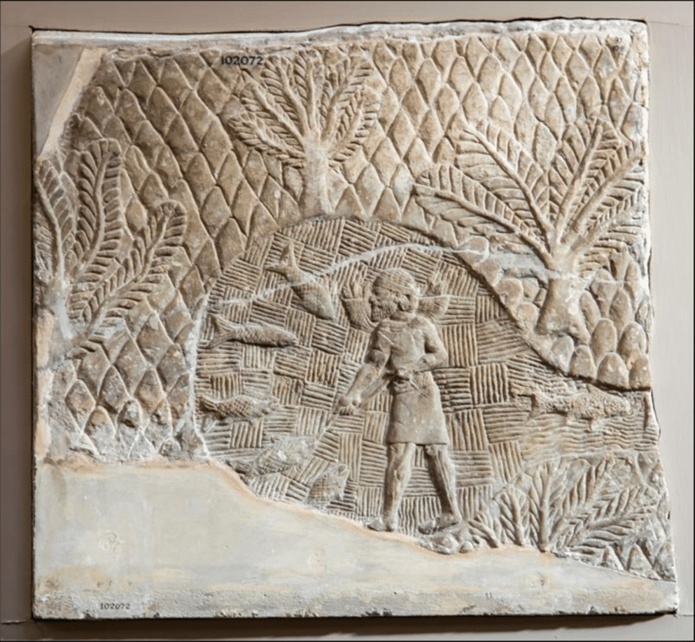 They fished in ancient Assyria as well. Here’s a relief from the 7th century BC showing a man fishing at a pool teeming with fish.