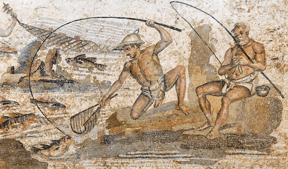 Here’s a Roman mosaic depicting a couple of guys fishing. I like the sun hat that one on the left wears and the net he uses to scoop the fish out of the water. The man sitting on the bank seems to be attaching a fly to the line.