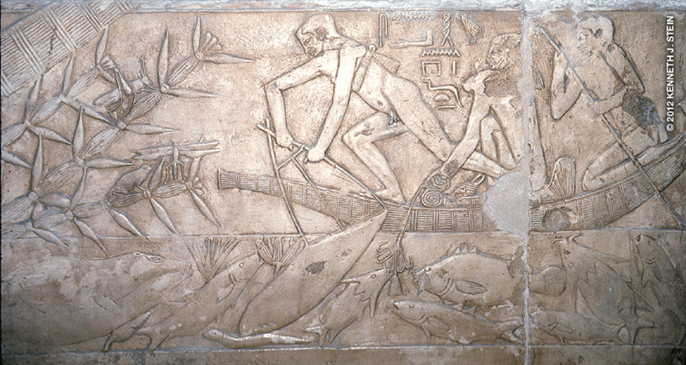 Wall paintings in various Egyptian tombs depict fishing scenes. Here’s a relief from the tomb of Kigemi, the vizier of Djoser who reigned during the Old Kingdom’s 3rd Dynasty, c. 2686 BC.