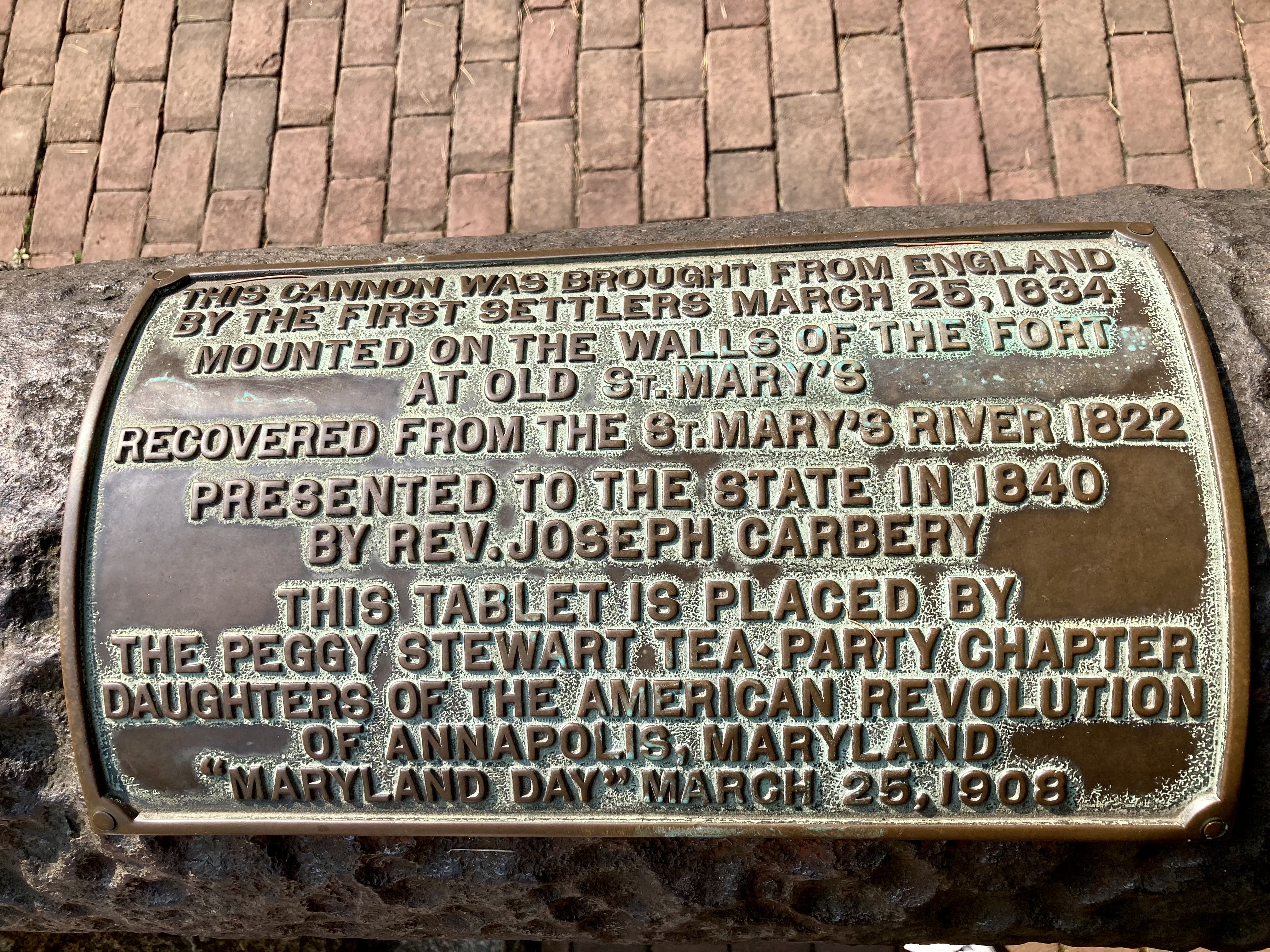 We also saw this old cannon that was brought by early settlers in 1634 and then found in the river in 1822. Naturally, the DAR presented the plaque.