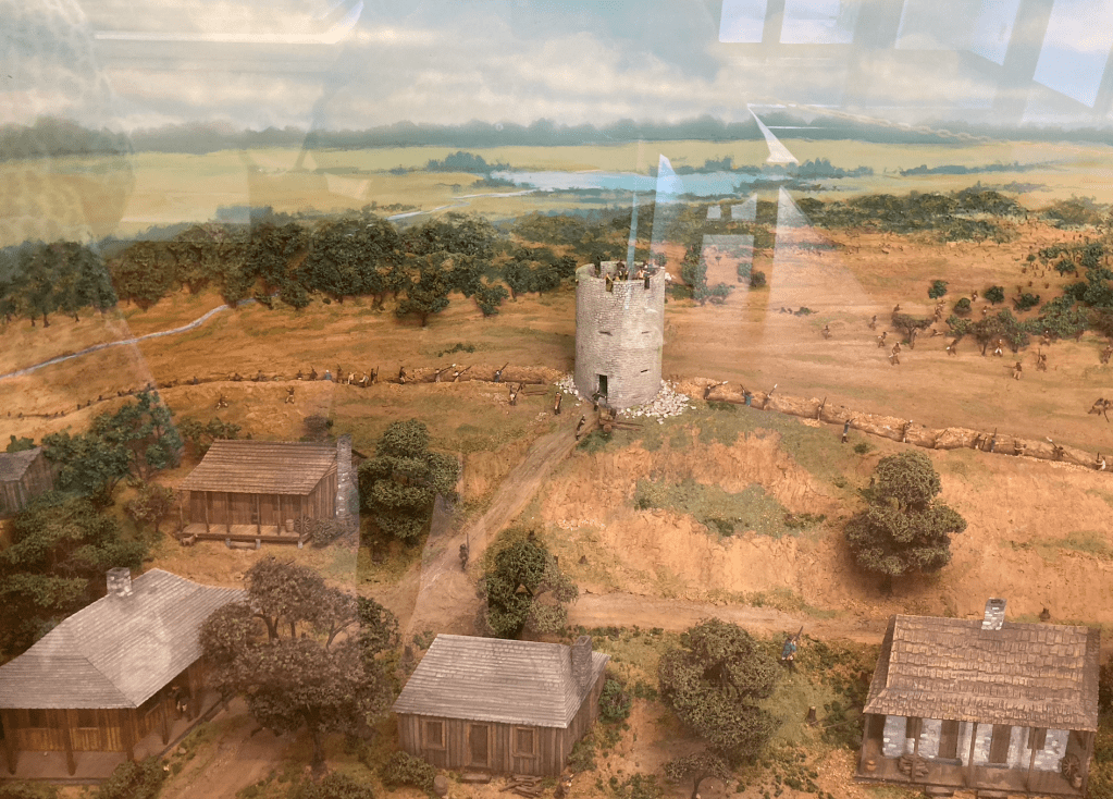 …where we learned about dinosaurs in the region (!) and the Revolutionary War battle of Fort San Carlos in St. Louis, a battle about which I knew nothing. (The Spanish Militia and some local Frenchmen marched the 50 miles up to St. Louis to fight off the mercenary Indians. It was really not much of a battle.) The fort was right about where Busch Stadium is now.