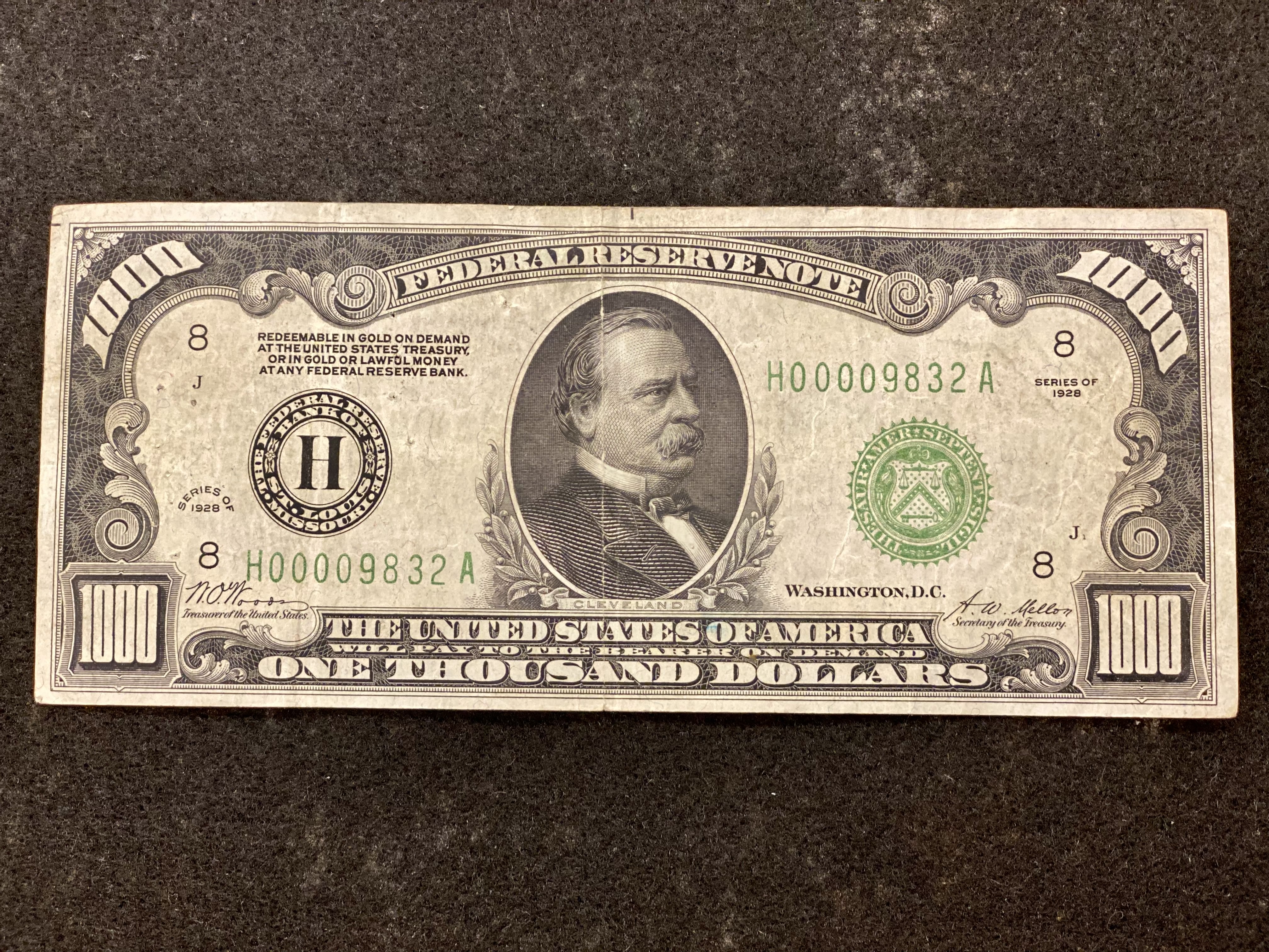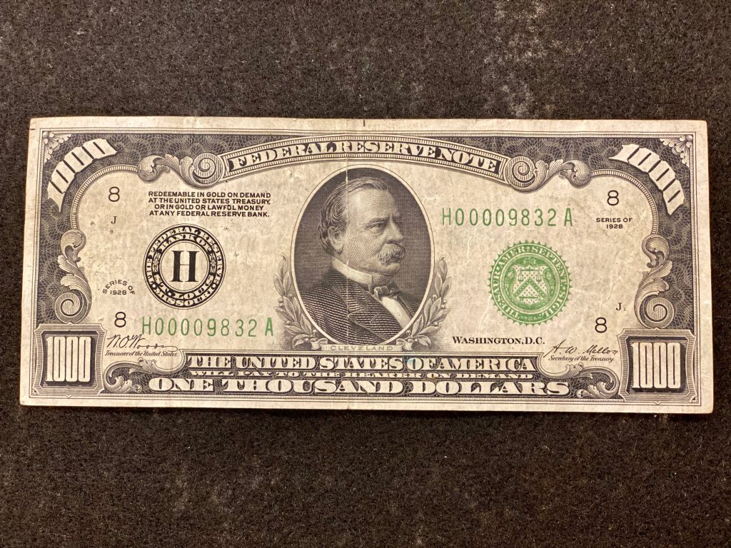 Anyway, the auction was a big success, with high attendance. I tend to think everything we sell is interesting because it was valuable enough to someone that they wanted to save it. Even if that item is a collector’s set of American Chopper PEZ dispensers. One interesting item we had this year–a thousand dollar bill from 1928! It features Grover Cleveland and was discontinued in 1969.