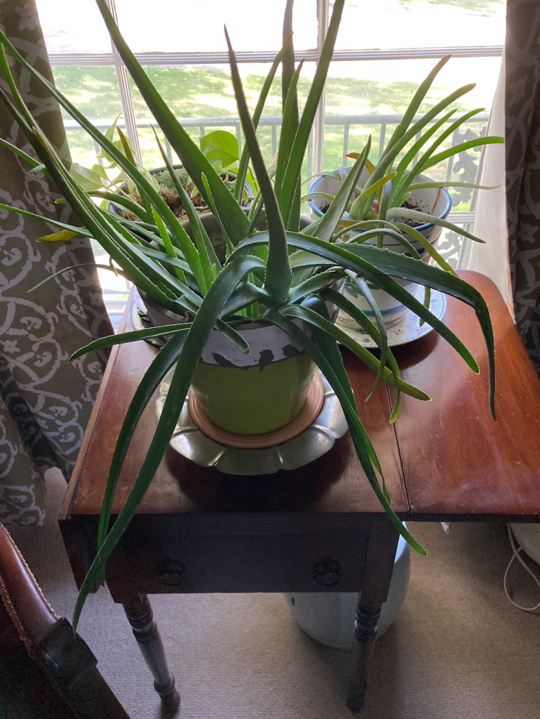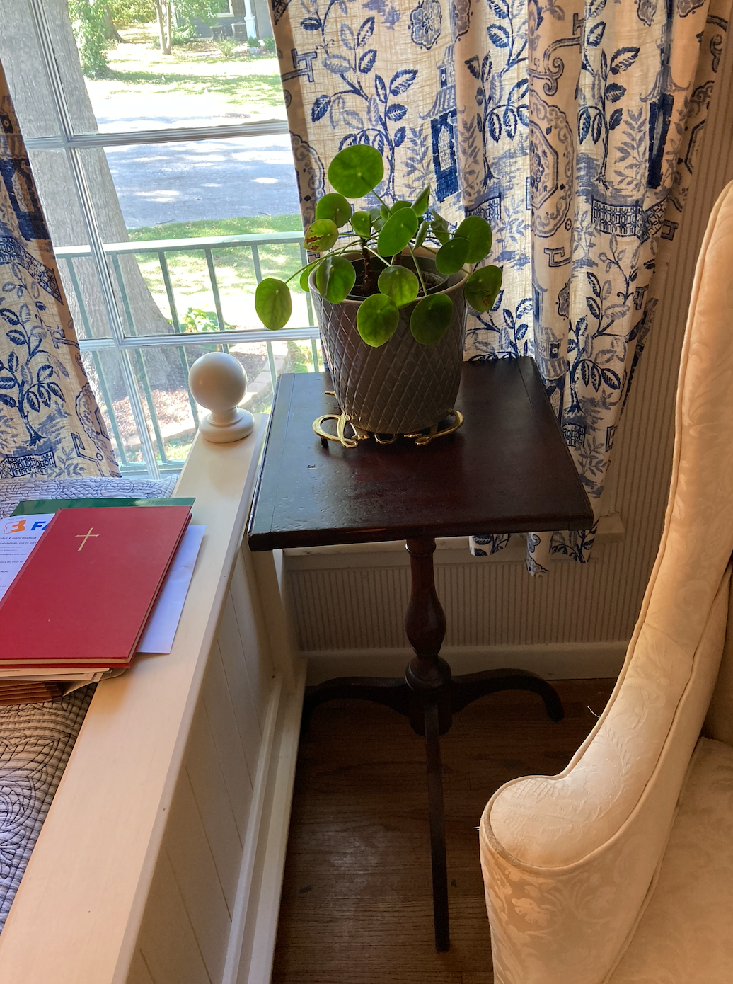 Earlier this week I picked up a nice 18th century candle stand at an auction. It works nicely as a plant stand–of which I need many!