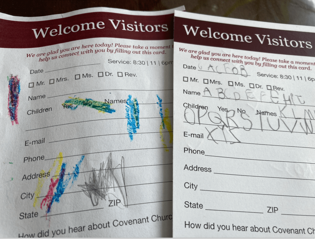 Lottie is such a big girl now–she sang along with one of the hymns and said the Lord’s Prayer (from memory)! The wee laddie filled out the Welcome Card, which he does every week.