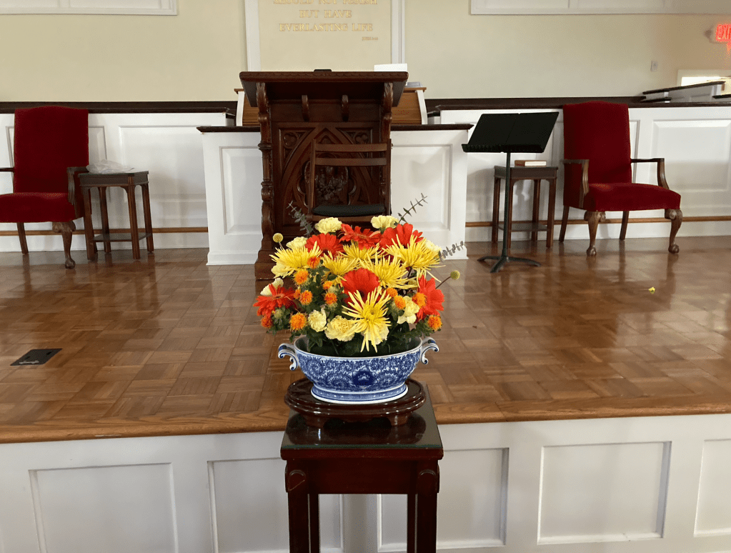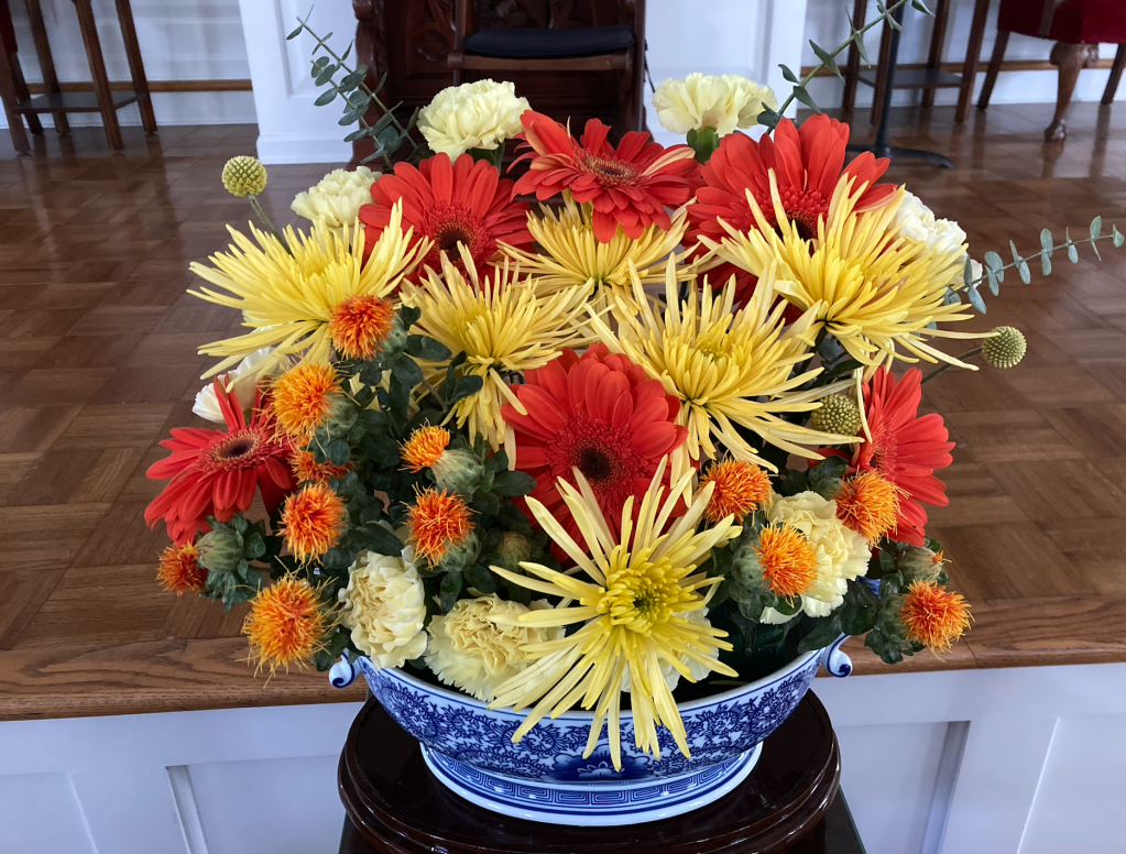 How was your weekend? Mine was a quiet one, mostly because I am still fighting this cold. I managed to “do” the flowers for church on Sunday–my maiden solo voyage so to speak and I was pleased with the result. I went to Trader Joe’s early on Saturday morning and bought a bunch of different flowers and then went to church, going in with my key and setting up in the sacristy…