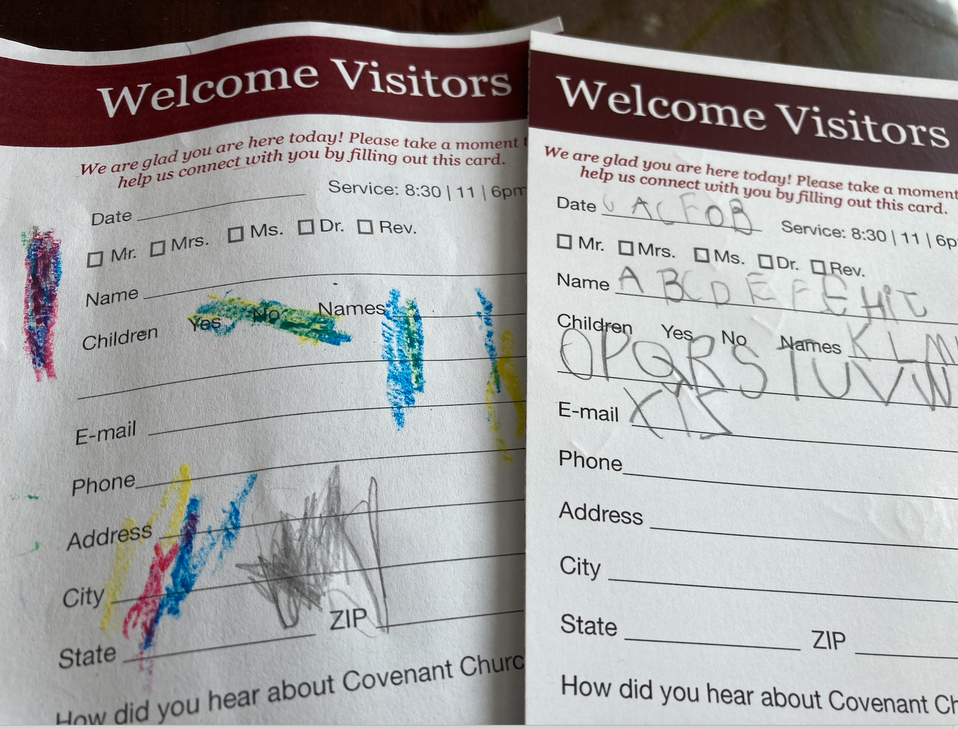 Lottie is such a big girl now–she sang along with one of the hymns and said the Lord’s Prayer (from memory)! The wee laddie filled out the Welcome Card, which he does every week.