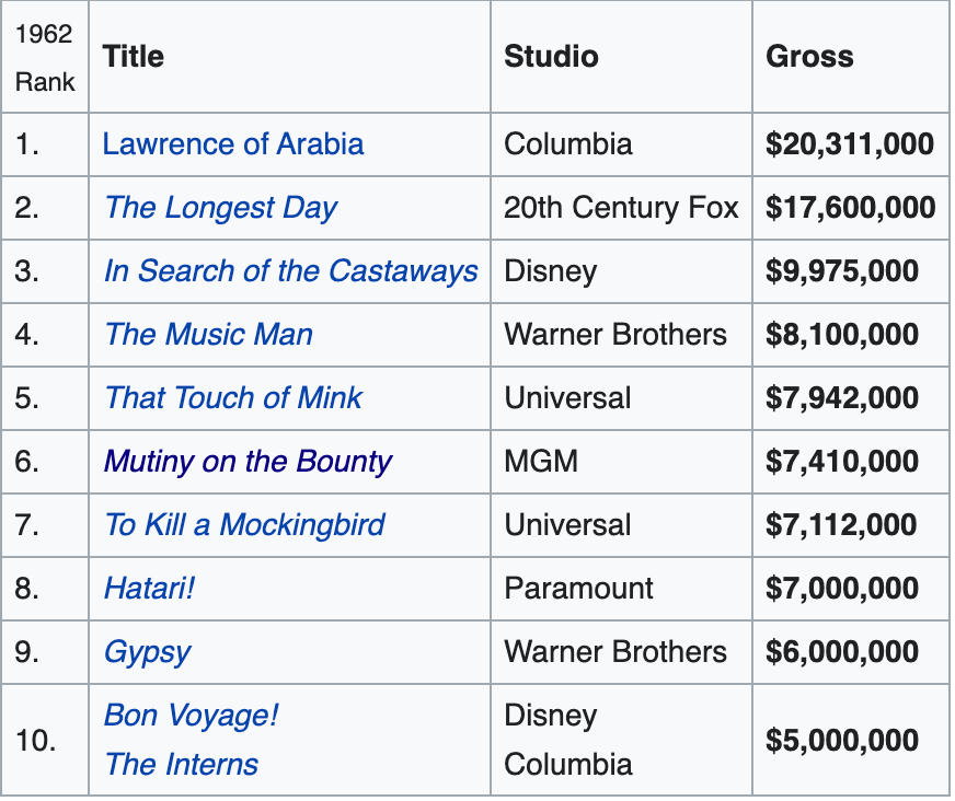 1962 was a great year for movies. The top money-makers were: