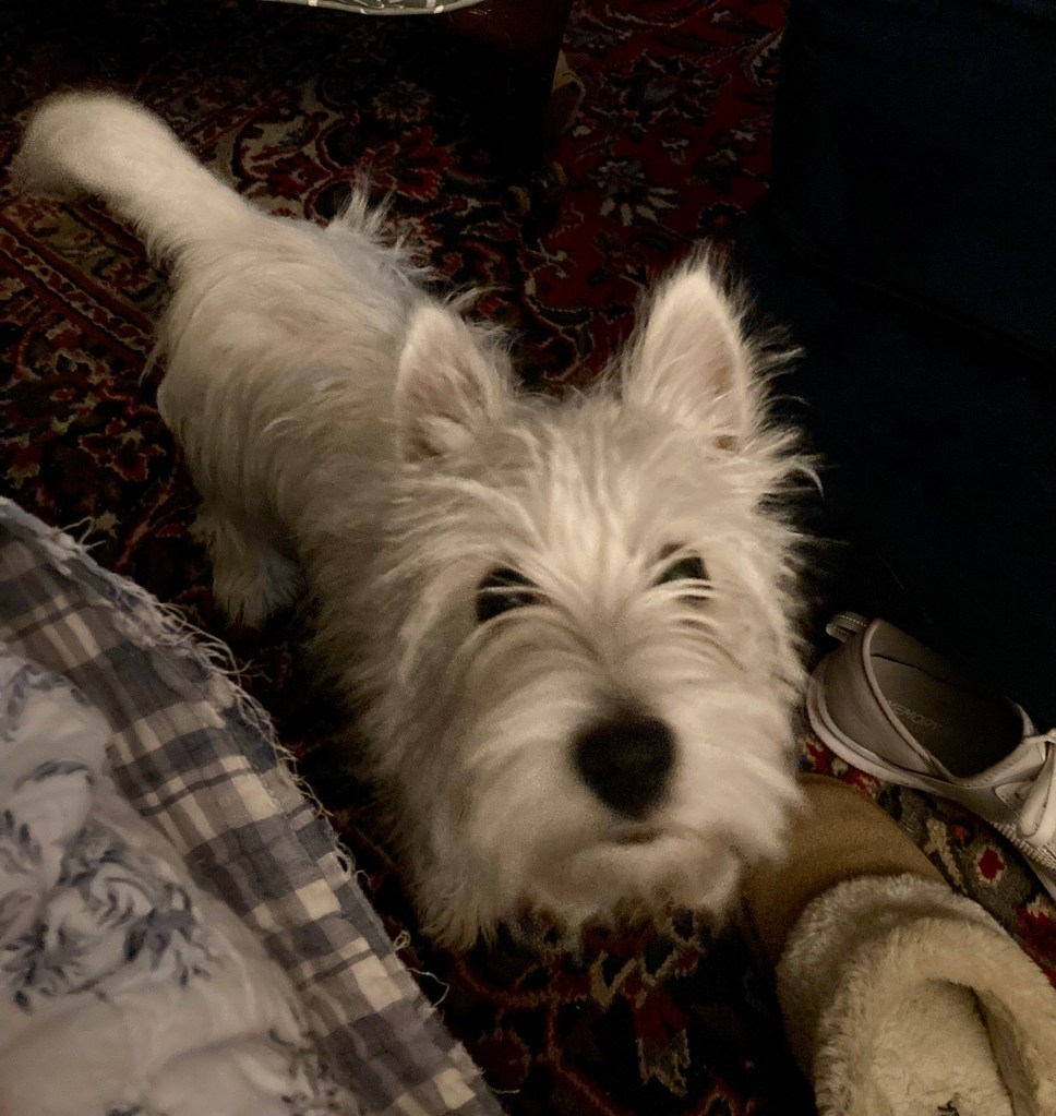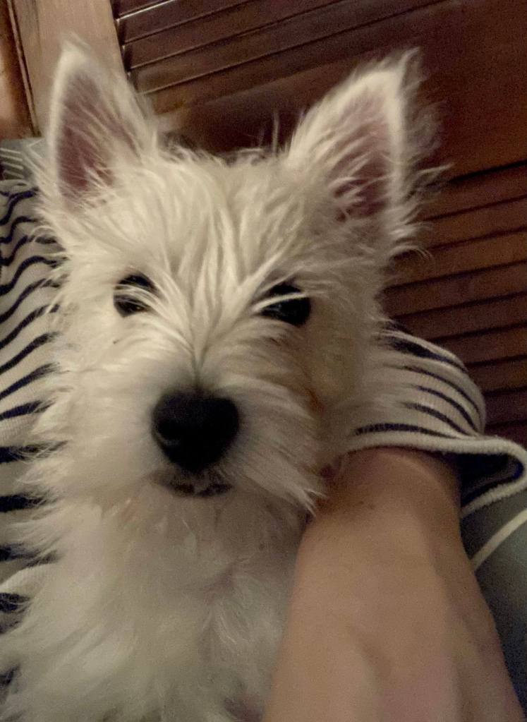 Mr. Smith is always so nice and clean after a bath. But since they blow dried his fur with a round brush, his face looks more like a Westie now. To quote Katie, “Mr. Smith is growin’ up!”