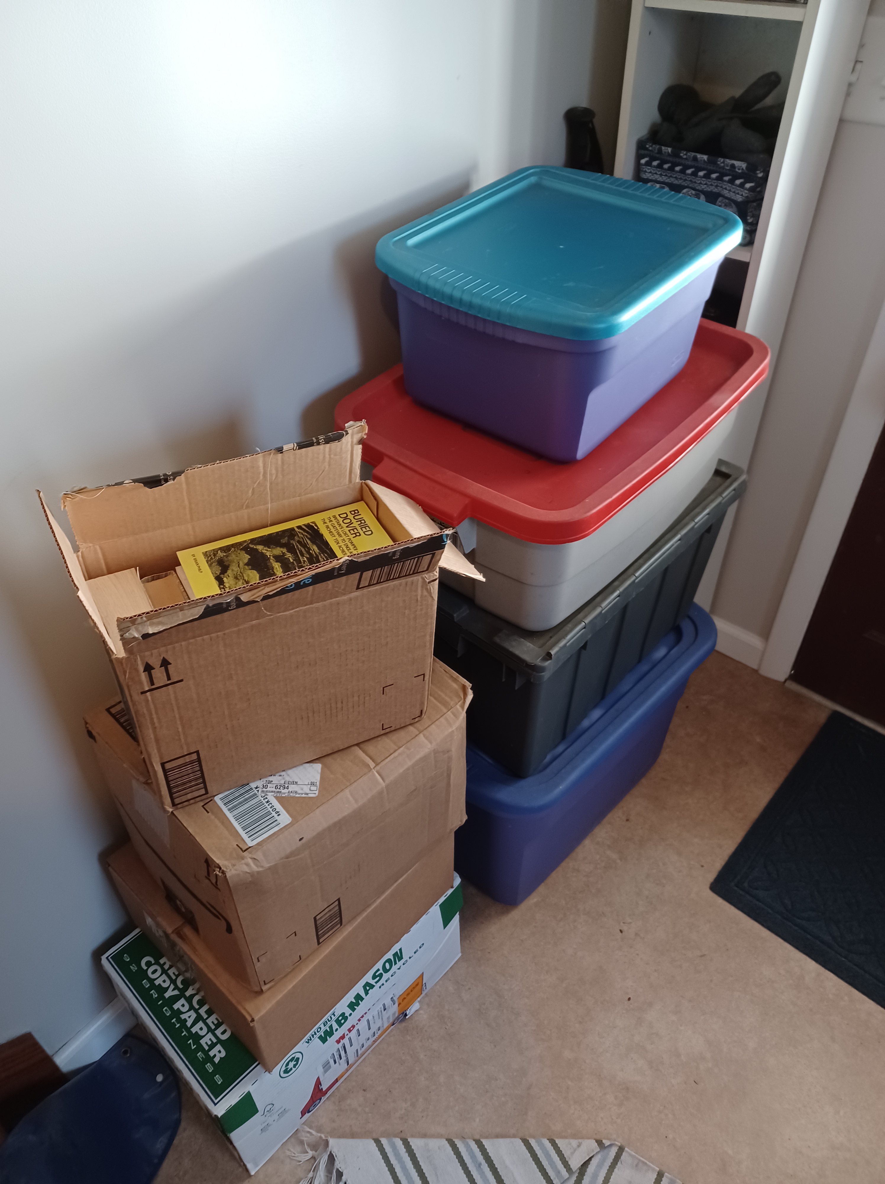 It’s funny how things work out: as my niece is moving into a house, we are moving out of one. A nice couple saw our cottage and contacted us through a friend to ask us about buying it. After much soul-searching, not to mention phone calls with children, we decided to sell. It is definitely time to let go, for despite our recent renovations, we haven’t spent a night there in years. Nevertheless, we did not anticipate how much hard work the move would entail, nor how completely it would disrupt our lives. We have been moving stuff home for several weeks now, and it seems that there is no end in sight. Boxes and tubs linger in our mudroom while we figure out what to do with them,