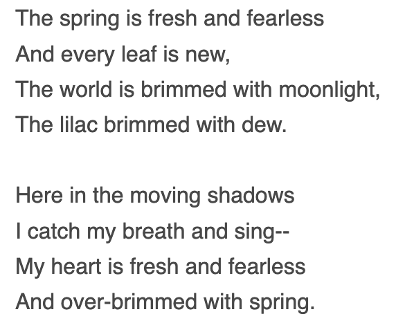 And here’s a poem for May–“May Night” by Sara Teasdale (1884-1933):