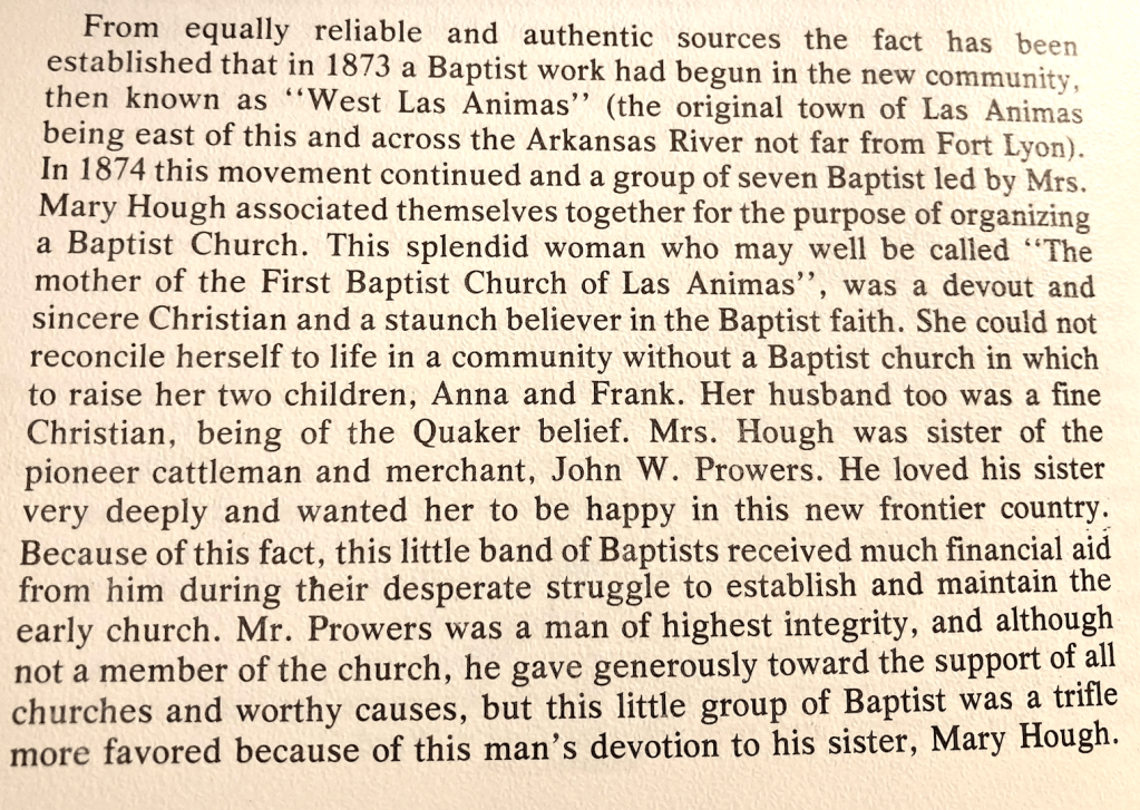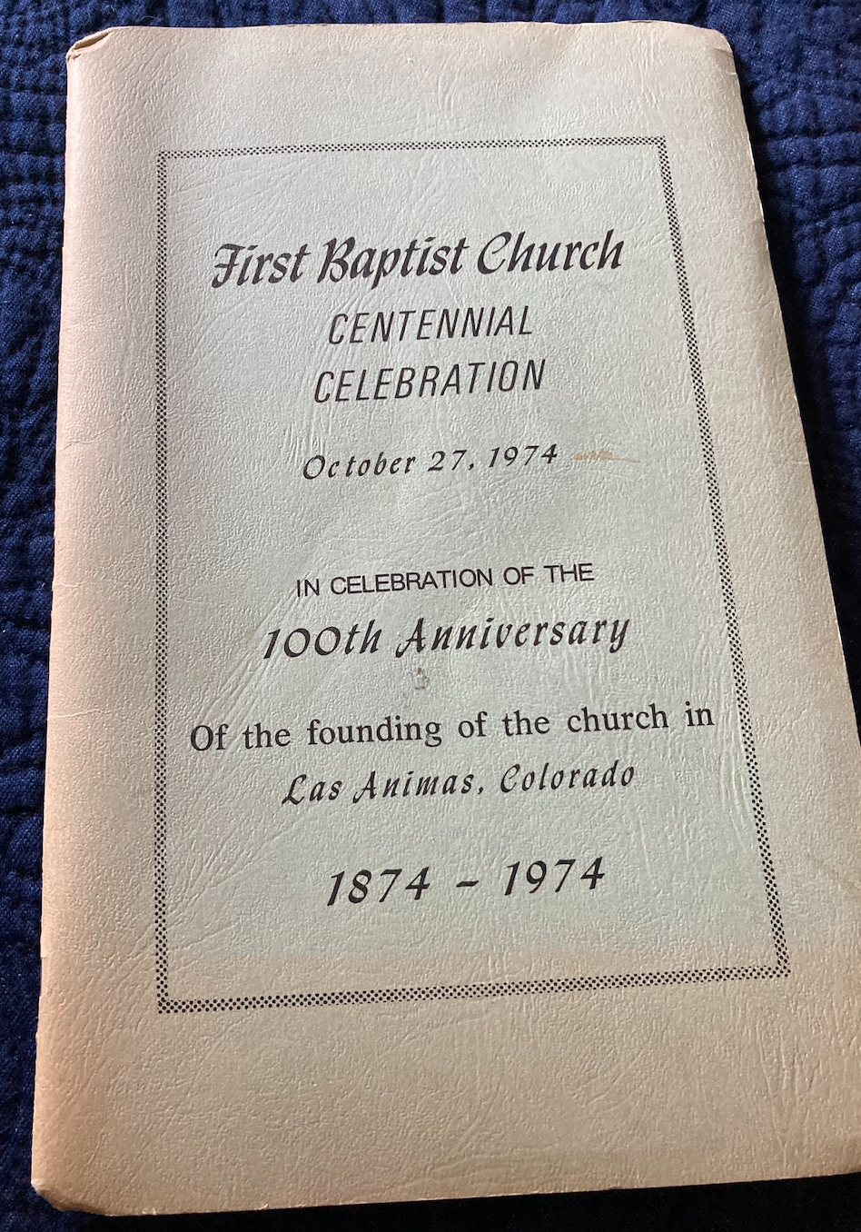 Recently I acquired a small battered book entitled “First Baptist Church Centennial Celebration–in Celebration of the 100th Anniversary of the founding of the church in Las Animas, Colorado 1874-1974”.
