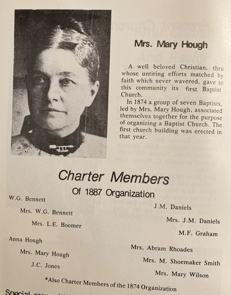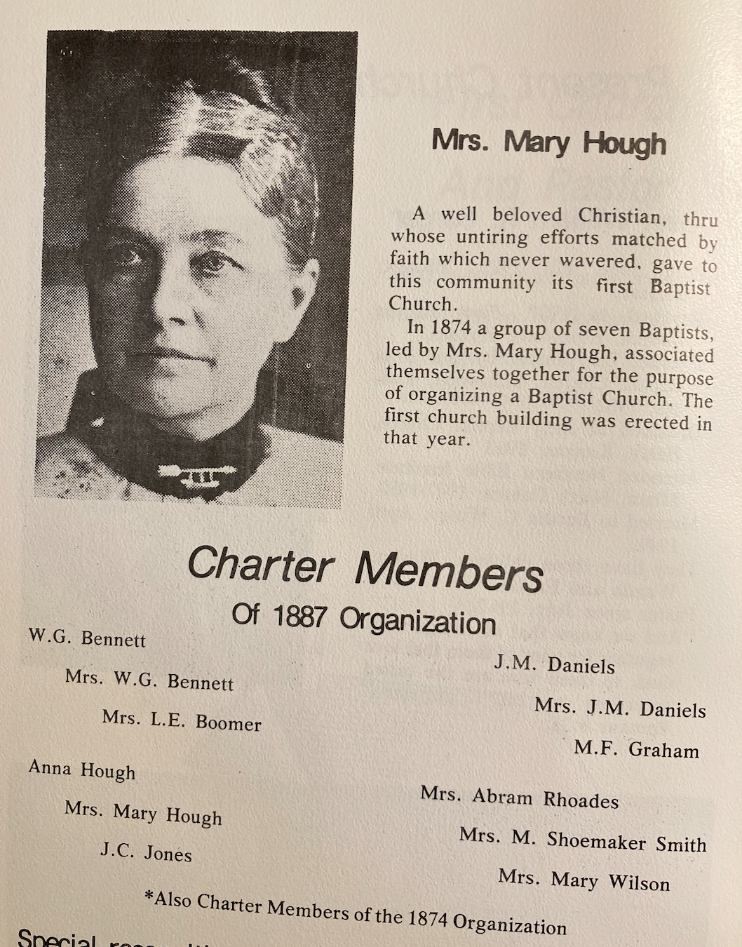 She was, indeed, a founding member, trustee, superintendent of the Sunday School, and the organist. Her husband, John S. Hough, was not a member; he was a Quaker and remained so his entire life. My great-grandmother Anna Hough was a member; she was 10-years old in 1874. Her two older sisters, Ida and Susie, would have been members too, but they died in 1875 and 1876 and were not included, therefore, in the list of charter members.