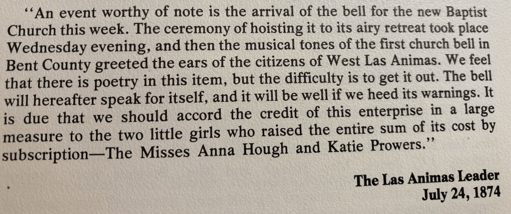 The original building was an adobe structure built on land owned by John Prowers. The bell on this church was known to be one of the first bells ever to ring in the Arkansas Valley.