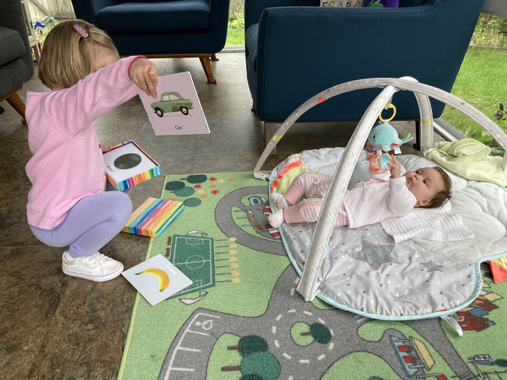 Ida’s birth (more so, my 2-night absence from home) may have been somewhat traumatizing for her, but Katie quickly adapted to her role as big sister this year. She treats her gently, stroking her face and hair just like I do, and she also treats her like a very important pupil. I have no doubt that Ida will learn everything she needs to know from Katie. (A common parenting “hack” in our household is to get Katie to do something — put on her shoes, get into her seat at the dining table — by asking if she can show Ida how it’s done.) It should come as no surprise that Ida is deeply enamored with her sister, who entertains her to no end.