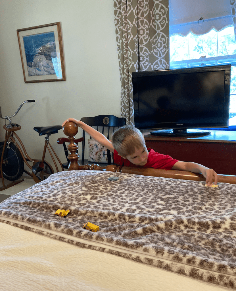We went upstairs (usually off-limits) to search for more Richard Scarry books in his Dad’s old room. Then he asked if he could go in my room because that’s where the mini trampoline is as well as my practically-an-antique stationery bike.