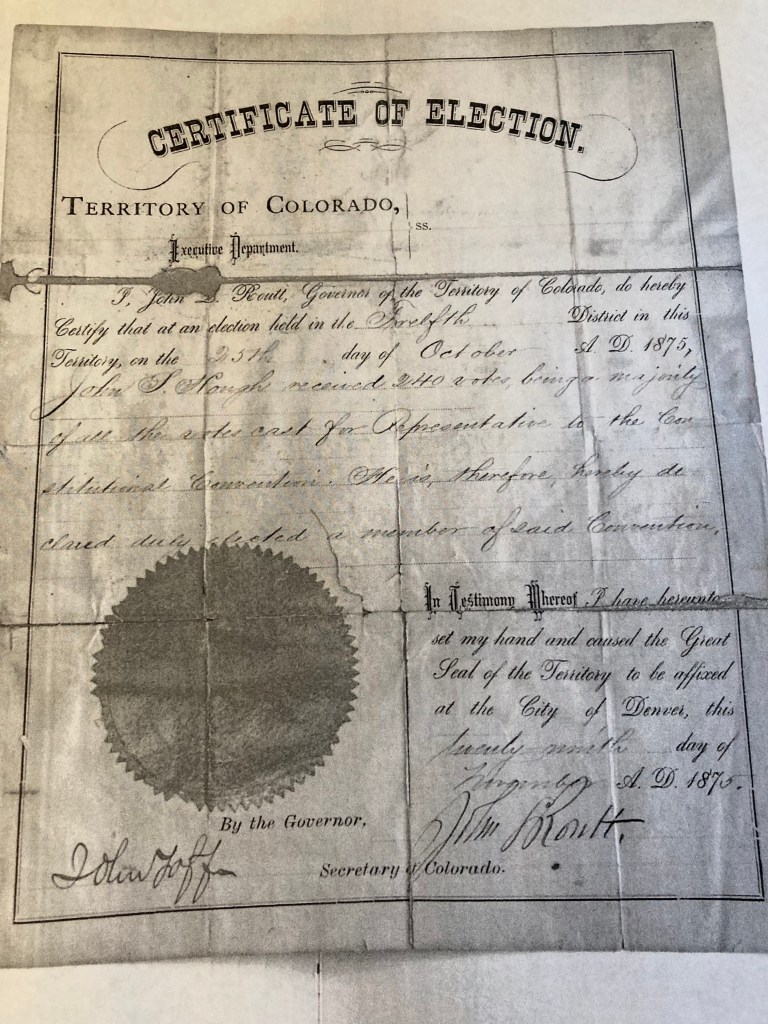 Several months prior, in December 1875, leading Colorado citizens gathered to draft a state constitution, among them our great-great grandfather John Simpson Hough, who represented Bent County.
