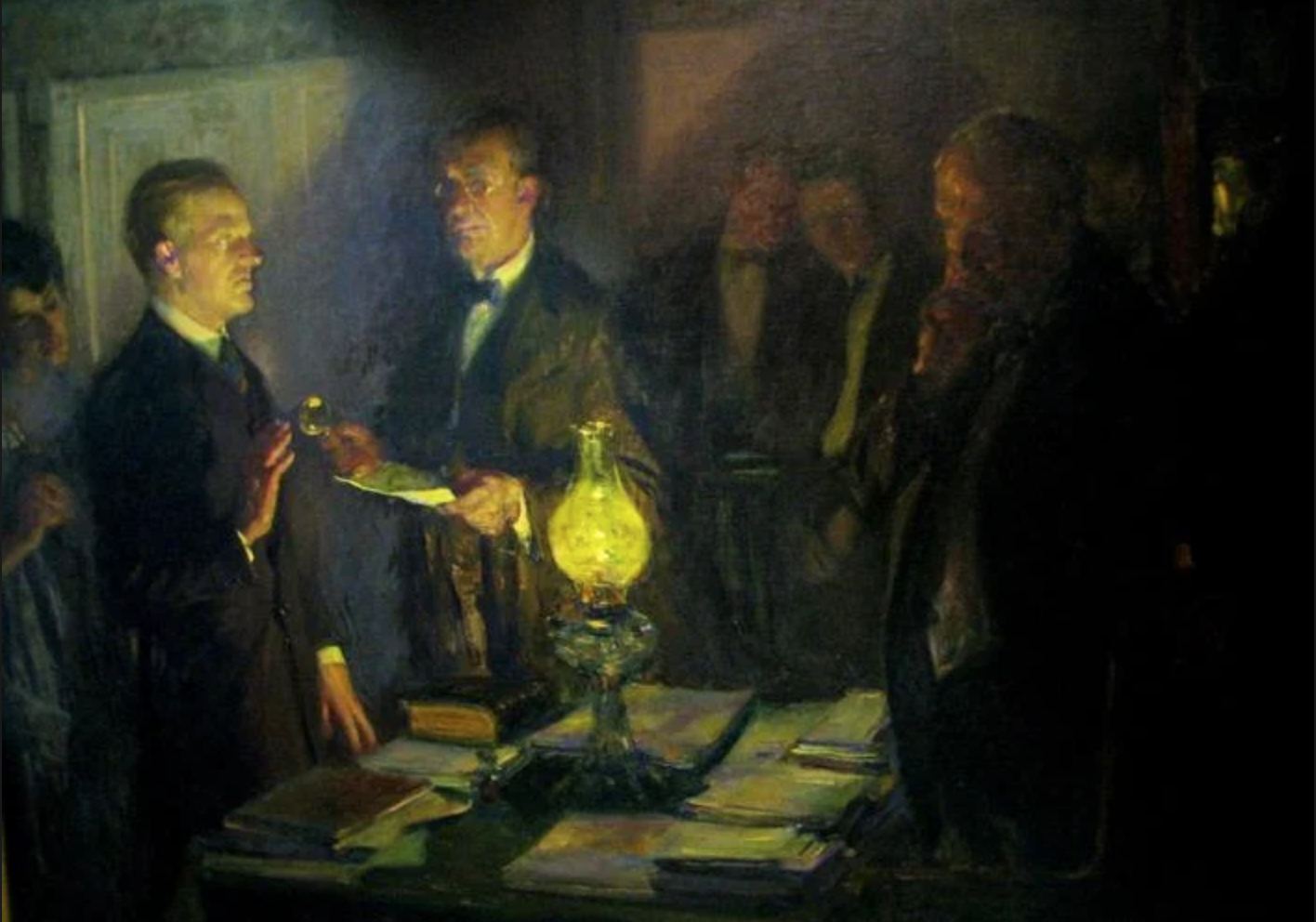 The painting is “The Swearing In of Calvin Coolidge by His Father” by Arthur I. Keller, 1923.
