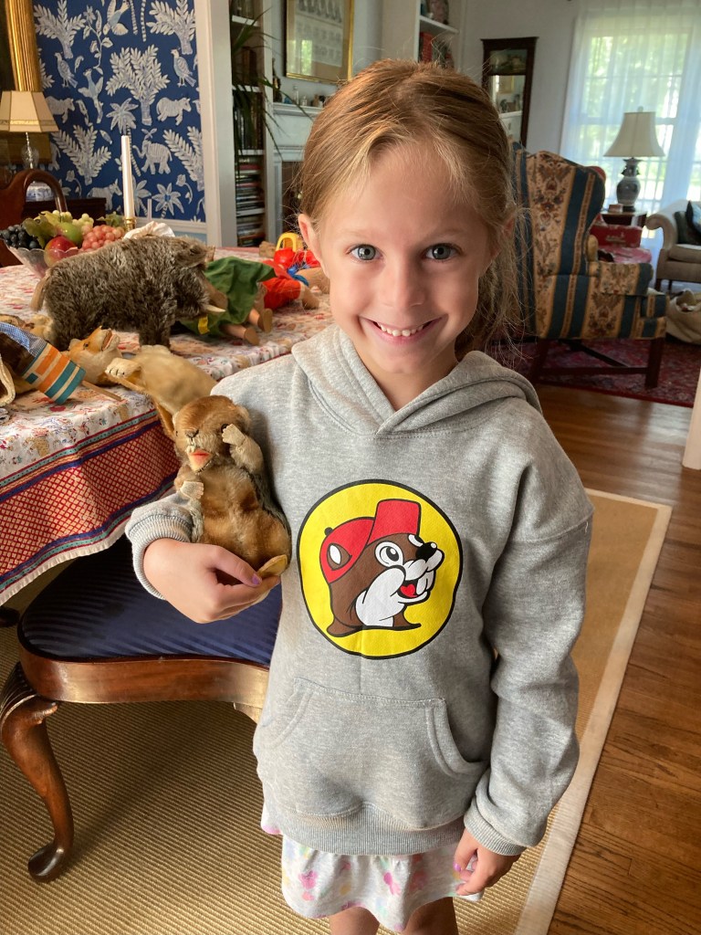 We went through the box of Steiff animals, which we thought would interest them, but they were not really impressed with my old collection. “Why are they called Steiff?” We did note that “Bucky” beaver matched Lottie’s Buc-ee’s sweatshirt which she got on their recent roadtrip to South Carolina.