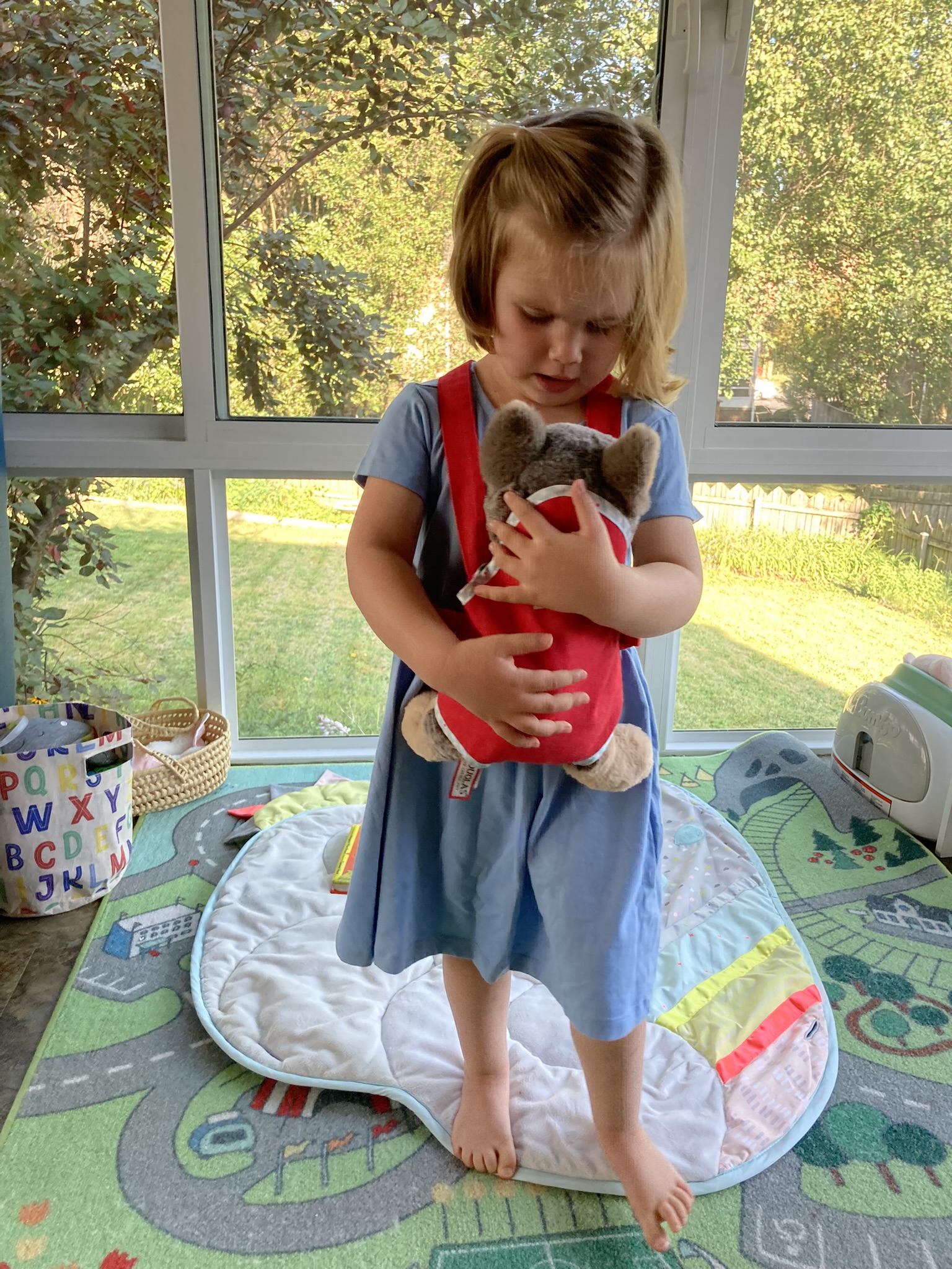 Because really, I can’t help but think being home with Ida and me has only amplified Katie’s own motherly, caretaking impulse. Babydoll and Katie’s animals receive around-the-clock attention, carried to and fro, put to bed in their bassinets, diapered and re-diapered, fed nutritious meals etc. While sometimes this can make life a little harder — well no, sweetie, babydoll does not need the highchair that Ida will sit in momentarily; we do not need to give “real food” to Clown Bear, and actually I do need this $0.36 diaper for the actual baby in the room — I also find it very sweet!