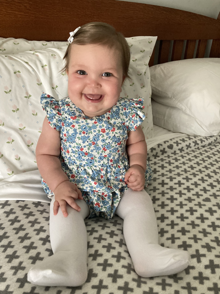 Months 6-9 have been wild for Ida. She has learned how to sit, crawl, stand up while supported, eat solids, and more. She has also learned how to assert herself. While she once sat contentedly passive while her sister ran the show, she will now shriek her demands. Hold me! Feed me! Let me put your shoes in my mouth! I think it’s a good thing. (The assertive nature, not putting shoes in one’s mouth.)
