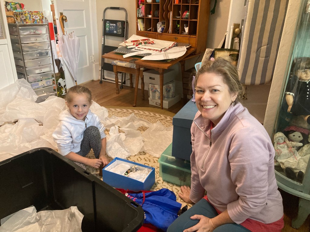 After the game Lottie and I went over to daughter #1’s house while the bud went to his team party with his Dad. We unpacked all the dolls and filled up the doll case, which you will recall we had moved last weekend.