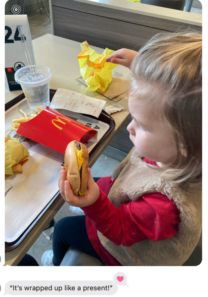 Meanwhile Katie shared a cheeseburger meal with her Mommy and said this: