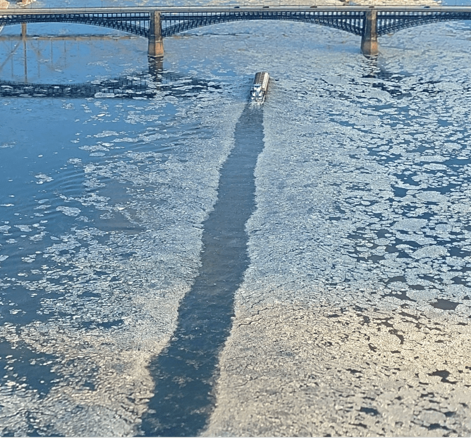 (Barge traveling in an icy Mississippi River near the Eads Bridge–Fox2 photo)