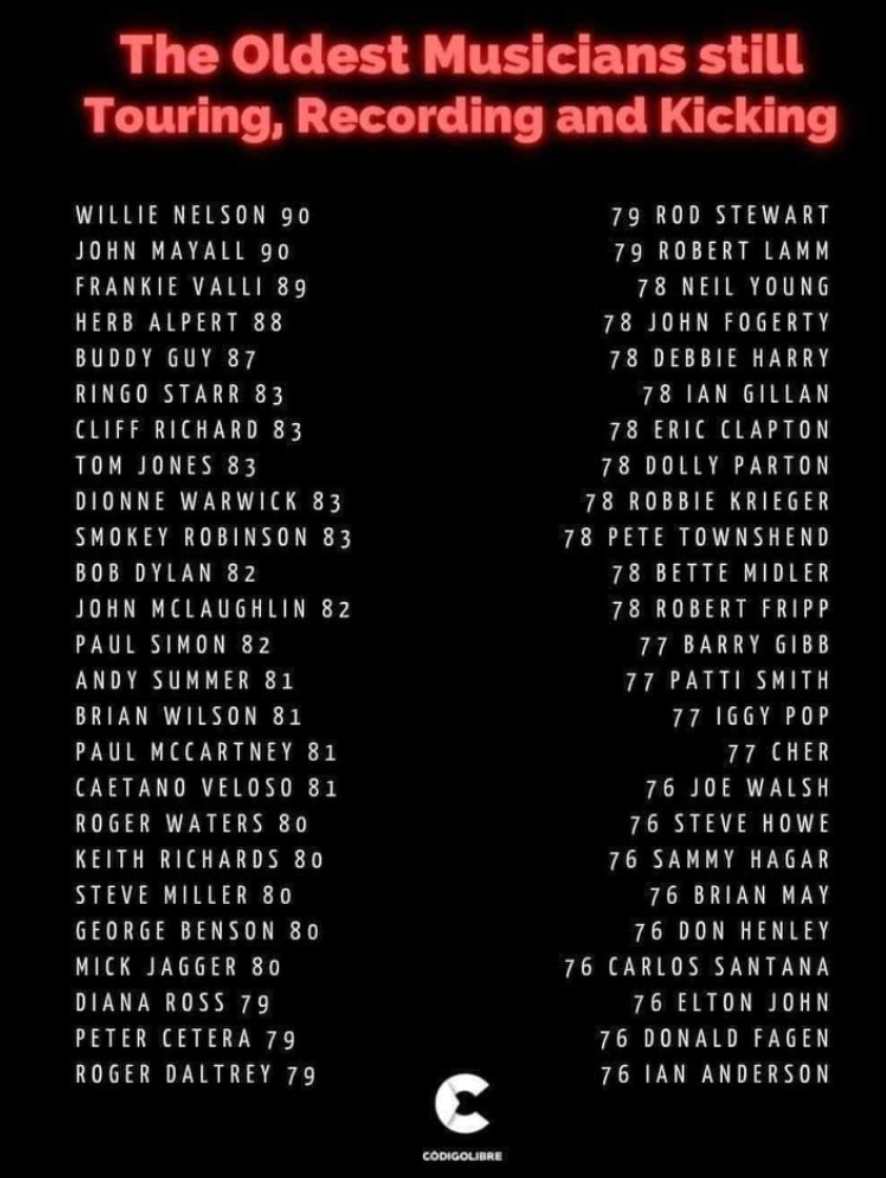He is 79 years old! Kudos for still touring. Here is a list of other oldsters who are still out there making music in public.