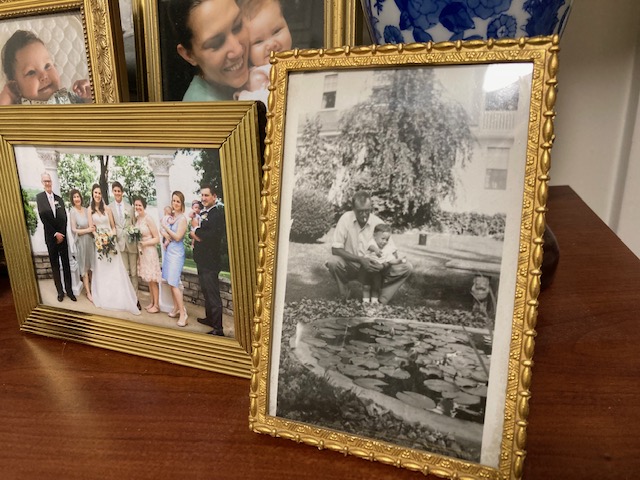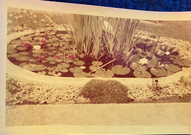 My cousin Steve recently sent me a box of treasures–old newspaper clippings and photographs of our maternal grandparents. Among them were some pictures of their house and yard, which I remember fondly. They had a fish pond.