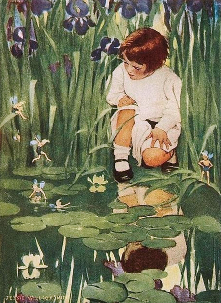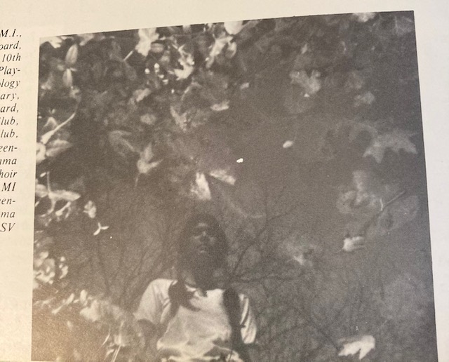 This made me think of the fish pond we had in the backyard of our house growing up. The yard had been professionally landscaped back in the 1920s or 30s, but by the 1960s when we moved in, it had seen better days. My mother discovered the pond, which had been filled in, and excavated it, bringing it back to life. It even had a working waterfall, but the unfiltered water killed the fish, so we never turned it on. I could not find a picture of the pond in my archive–only this artsy one of my reflection in it which graced my senior yearbook page. (Ye gods!)