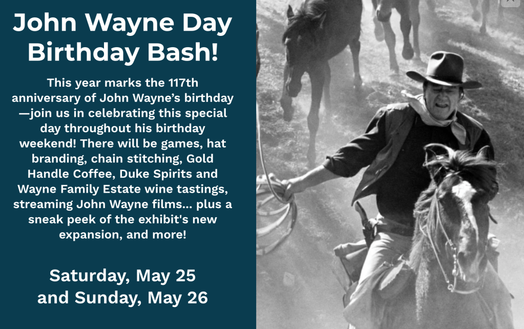 In case you need reminding, Sunday is John Wayne’s birthday. He would be 117. If you are in Fort Worth, be sure to sign up for
