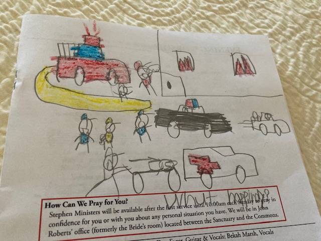 On Sunday the boy and the twins joined us at church and they earned A++ marks for depravity-free behavior. They are big 2nd graders now so they stay for the whole service!